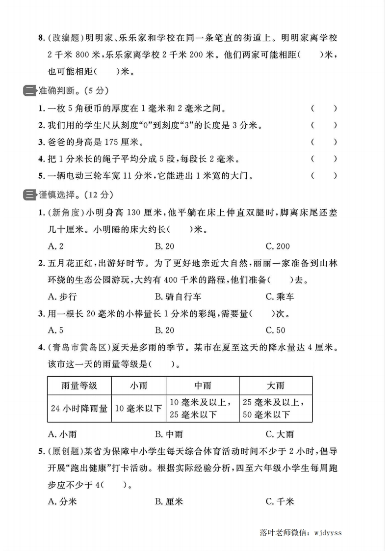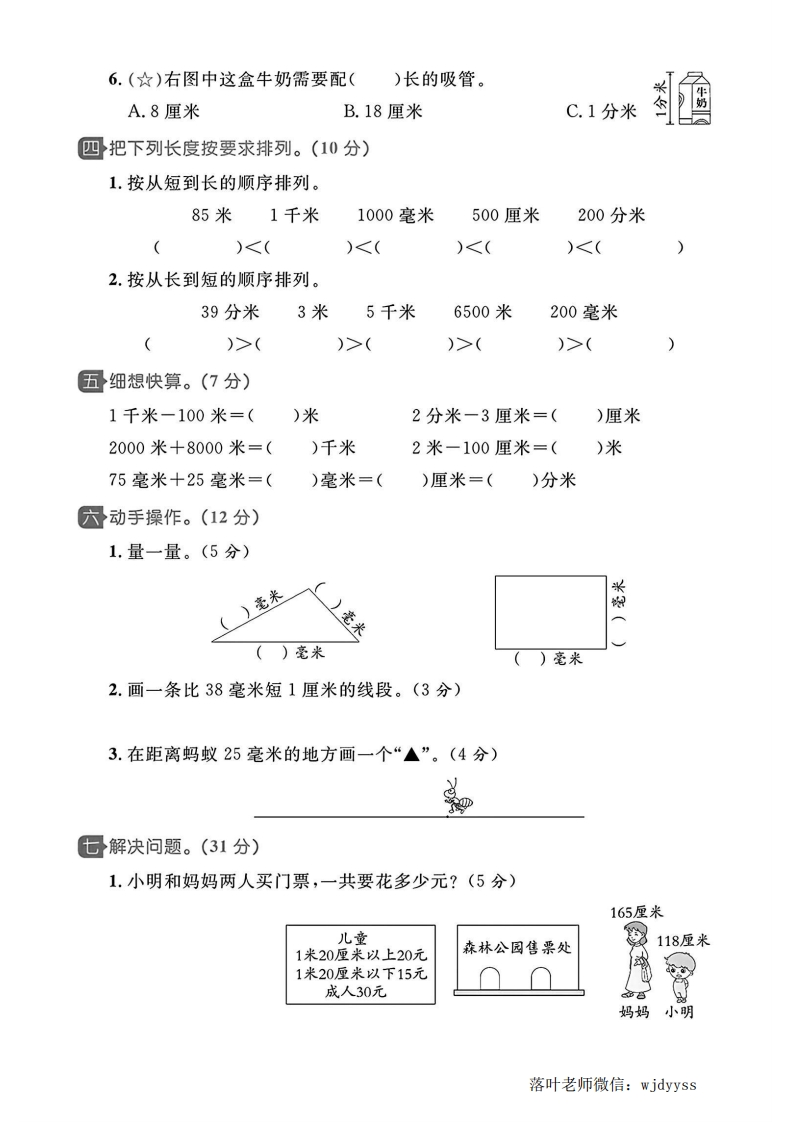 2025青岛63制三年级数学上册单元测试卷第一单元测试卷密⊙测试时间:60分钟⊙满分:100分十卷面:5分评价数一仔细填空。(23分)1.在()里填上合适的长度单位。这条路限速每小时70()大约能跳20()从家到学校有2()远童2.①②江0①号铅笔长()毫米,②号铅笔长()毫米。两支铅笔的长度相差()厘米。3.填一填。宽约6厘米宽约2分米步长约为每秒大约孙40厘米飞行8千米)毫米)厘米)分米)米4.在(○里填上“>”“<”或“=”2分米(○8毫米5厘米(○50毫米1千米○100米200厘米(○2分米999米○1千米50分米○4米5.一根蜡烛长1分米2厘米,点燃一段时间后还剩7厘米,这根蜡烛燃烧了线)厘米。6.文化广场花园一周长100米,黄爷爷每天早晨走1千米,要走()圈,他今天已经走了6圈,还差()米正好走完1千米。7.(☆)月2分米如图,将这个纸条每4厘米剪一段,可以剪成(段,需要剪()次。落叶老师微信:wjdyyss