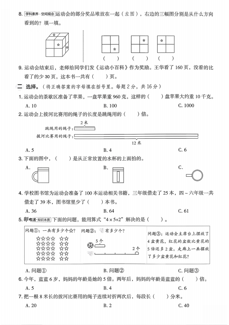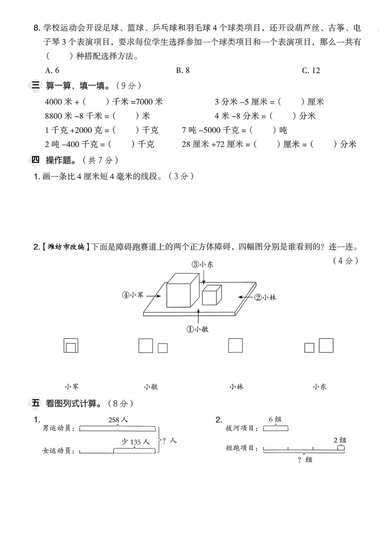 2025青岛63制三年级数学上册期中测试卷时间:60分钟满分:100分在阳光洒满操场的金色午后,一年一度的运动会如约而至,它不仅是一场体育竞技的盛宴,更是青春活力与激情碰撞的璀璨火花。填空。(每空1分,共33分)blo1.学科素养·量感在括号里填上合适的单位。部三年级的天天决定参赛,他身高135(),体重35()。他早上吃了一块重150()的蛋糕补充能量,然后背着2()的运动包,坐着载重约10()弥的校车来到学校。到了操场,他坐在高7()的长椅上,拿出重约80()的比赛手册认真阅读。2.为了记录运动会的精彩瞬间,学校设立了照片墙。三年级上传了190张照片,四年级上b传了160张照片。苹(1)两个年级一共上传了多少张照片?解决这个问题时,表示总量的是(),表示分量的分别是()和(),用到的总量和分量的关系是((2)四年级上传的照片比三年级少多少张?封解决这个问题时,表示总量的是(),表示分量的分别是()和(),用到的总量和分量的关系是(3.运动会开幕式上,彩旗队的大彩旗有5面,小彩旗的数量是大彩旗的8倍,小彩旗有(面。小彩旗再加5面,就是大彩旗面数的()倍。4.运动会上使用的接力棒长()毫米,比3分米短()毫米。继:mTTTTTTTr十ITTTTTTTTur数01640111514151311号33112253.23别线5.【枣庄市改编】龙龙参加了举重比赛,他的体重约是20千克,()个这样的龙龙的体重约重1吨。6.学校为了装饰运动会场地,用彩带制作花朵。做一朵小花用3分米彩带,做一朵大花用的比小花的5倍多2分米。做一朵大花用多少米彩带?先求(),算式是(),再求(),算式是()o7.把5米、5厘米、60毫米、5分米、5千米按从短到长的顺序排列。)<()<()<()<(