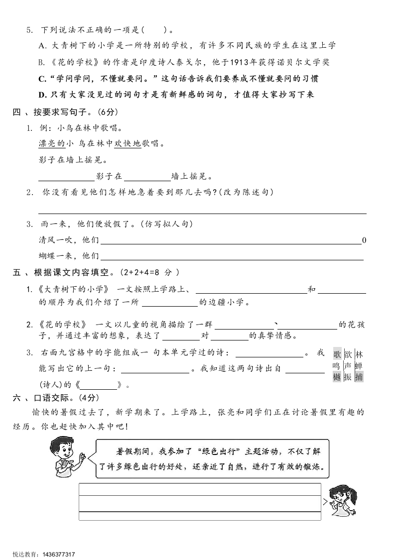 2025人教版三年级上册语文单元试卷第一单元测试卷(时间:60分钟满分:100分)题号三四五六七总分得分一、看拼音,写词语。(12分)rong qiufu zhuangsuyǒuying zi()cu xinneng goufeng didaban密))shou bizao chenpiao yangzhen yu)()二、巧辨形近字,填一填。(8分)[汉汗]()族()水流())字[杨扬]表()()树()柳()起三、选择正确的答案。(填序号)(10分)1.下列加,点字读音完全正确的一项是()。A洁白(i)诵读(sh ong)B.凤凰(fen)糊涂h)线C.坪坝(bèi)清楚(ch)D.摔跤(shuai)照例i)2.下列词语搭配有误的一项是()。A.古老的铜钟好奇地听着B.粗壮的树千欢快地歌唱C.洁白的墙壁流利地背诵D.湿润的东风安静地狂欢3.“书里说的是什么意思,他一点儿也不懂。”要读出“什么也不懂”的语意,应该重读()。A.一点儿B.什么C.意思D.也4.下列句子中标,点符号使用有误的一项是()。A.这时,花孩子们便穿了紫的、黄的、白的衣裳,冲了出来。B.后来,有个同学问孙中山:“你向先生提出问题,不怕挨打吗”?C.“会背了。”孙中山说着,就把那段书一字不漏地背了出来。D.“当,当当!当,当当!”大青树上的铜钟敲响了。悦达教育:1436377317