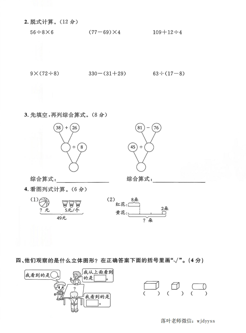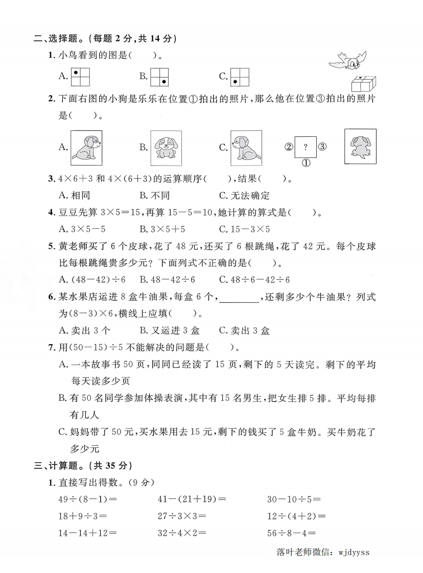 2025人教版三年级数学上册第一次月考卷(检测范围:第一、二单元)(时间:60分钟满分:100分)评价:一、填空题。(每空1分,共23分)1.计算54一18÷6时,应先算()法,再算()法,结果是();如果要改变运算顺序,先算54一18,那么算式应变为()。2.在○里填上“>”“<”或“=”。孙5×6+6○35(3+5)×2○3+5×246-(20+16)○2×538○6×7-320-4÷4○20-(4÷4)15+25÷5○(15+25)÷53.下面四个小朋友分别看到了哪幅图?把相应的序号填在括号里。s②③款4.下面右边的三幅图分别是哪只小动物看到的?填一填。=且杀器5.面包店做了54个面包,上午卖了23个,下午卖了17个,还剩几个?笑笑列出的算式是54一(23+17),她的想法是先求(再求()。6.聪聪和明明看课外书,聪聪每天看8页,明明每天看6页,他们看了3天。算式8×3解决的问题是();若要解决的问题是招聪聪比明明3天多看多少页,则列式为()。洲7.黄老师有54元钱,买3支笔用去9元,用剩下的钱买5元一个的笔袋,最多可以买()个。8.涂涂在计算“35一☐÷5”时,先算减法,后算除法,算得的结果是5。正确的结果是()。落叶老师微信:wjdyyss