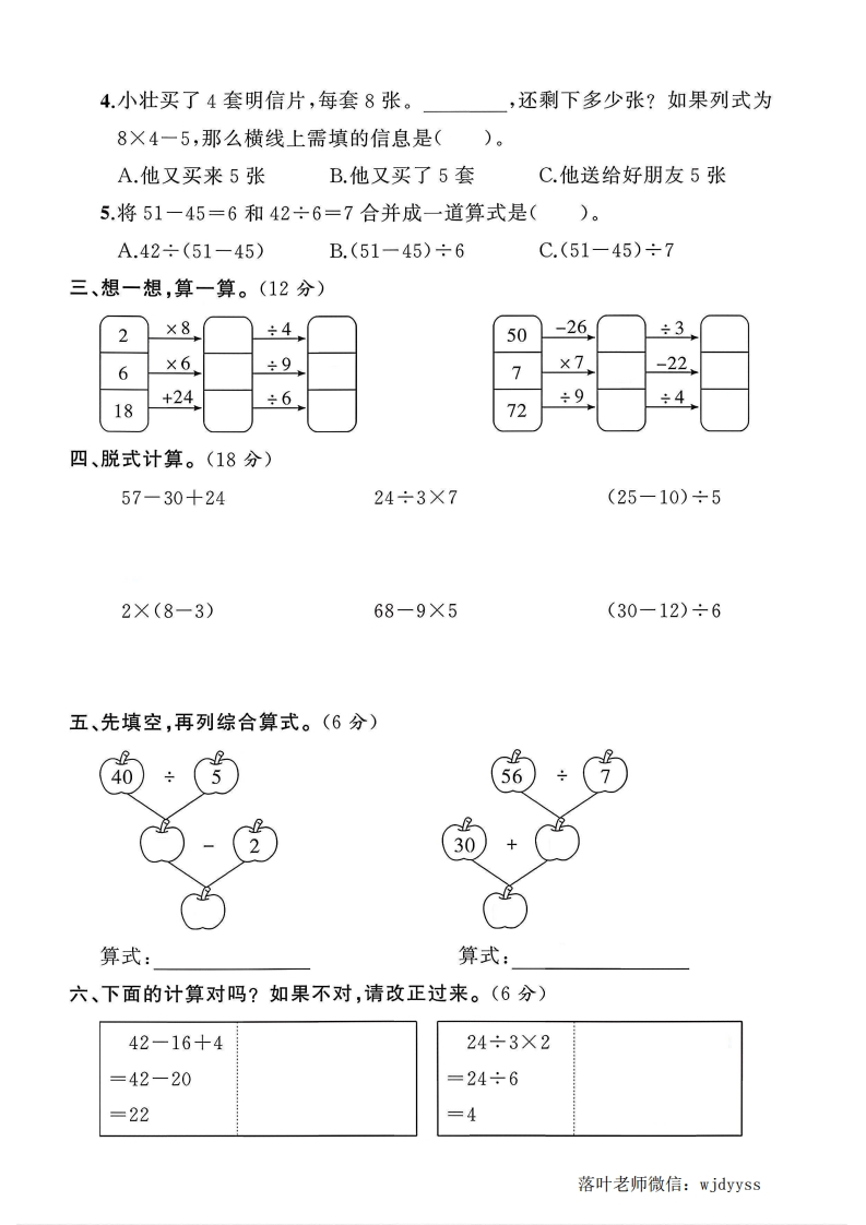 2025人教版三年级数学上册单元测试卷第二单元测试卷时间:90分钟满分:100分+10分题序三四五六七八附加题总分器得分一、填一填。(每空1分,共16分):弥1.在计算40+8×2时,要先算()法,再算()法;在计算7×(8-5)时,应先算()法,再算()法。封2.8×4+3的结果是(),如果要改变运算顺序,添上括号后的算式是(淑)。3.在○厘填上“>”“<”或“=”。线54÷9÷3○(46-38)÷4(50-40)÷5○50-40÷5内40-9×3○32÷4+418+5×7○(18+7)÷54.6与9的积,减去33,得数是()。5.把6十3=9和9×6=54合并成综合算式是()。不6.学校举行文艺汇演。三年级同学站了6排,每排8人,一共有()人。其中女生有32人,男生有()人。要7.畅畅编了37个中国结,自己留下了12个,其余的要送给自己的5个朋友。平均每个朋友能得到()个中国结。8.小夕在计算☆一2×3时弄错了运算顺序,先算减法后算乘法,得数是27。新☆是()。题二、选一选。(将正确答案的序号填在括号里)(10分)1.下面选项中与算式93一58一16的计算结果相同的是()。A.93-(58-16)B.93-(58+16)C.93-58+162.4本课外书共32元,一支铅笔5元。一本课外书比一支铅笔贵多少元?列式正确的是()。(风-有)元A.32÷4-5B.32-4-5C.32-(4+5)3.下列算式中括号可以省略的是()。A.(63+18)÷9B.(6×6)÷4C.(3+5)×7落叶老师微信:wjdyyss