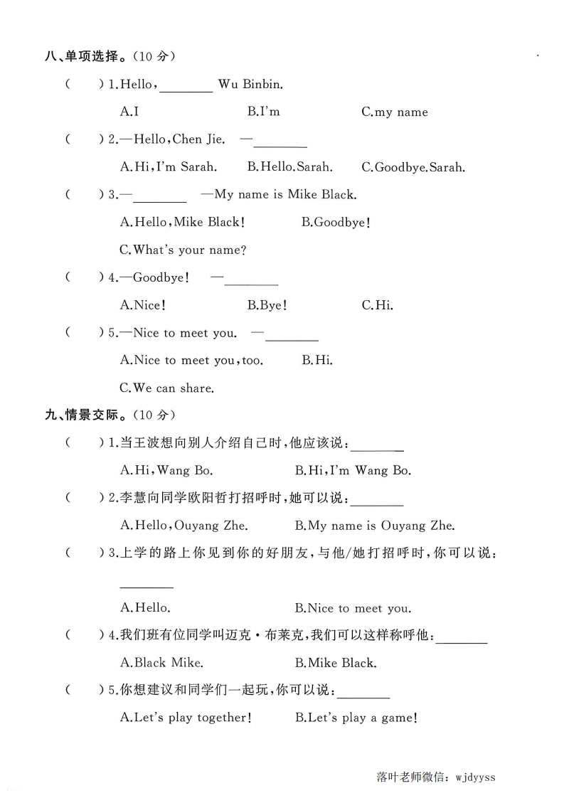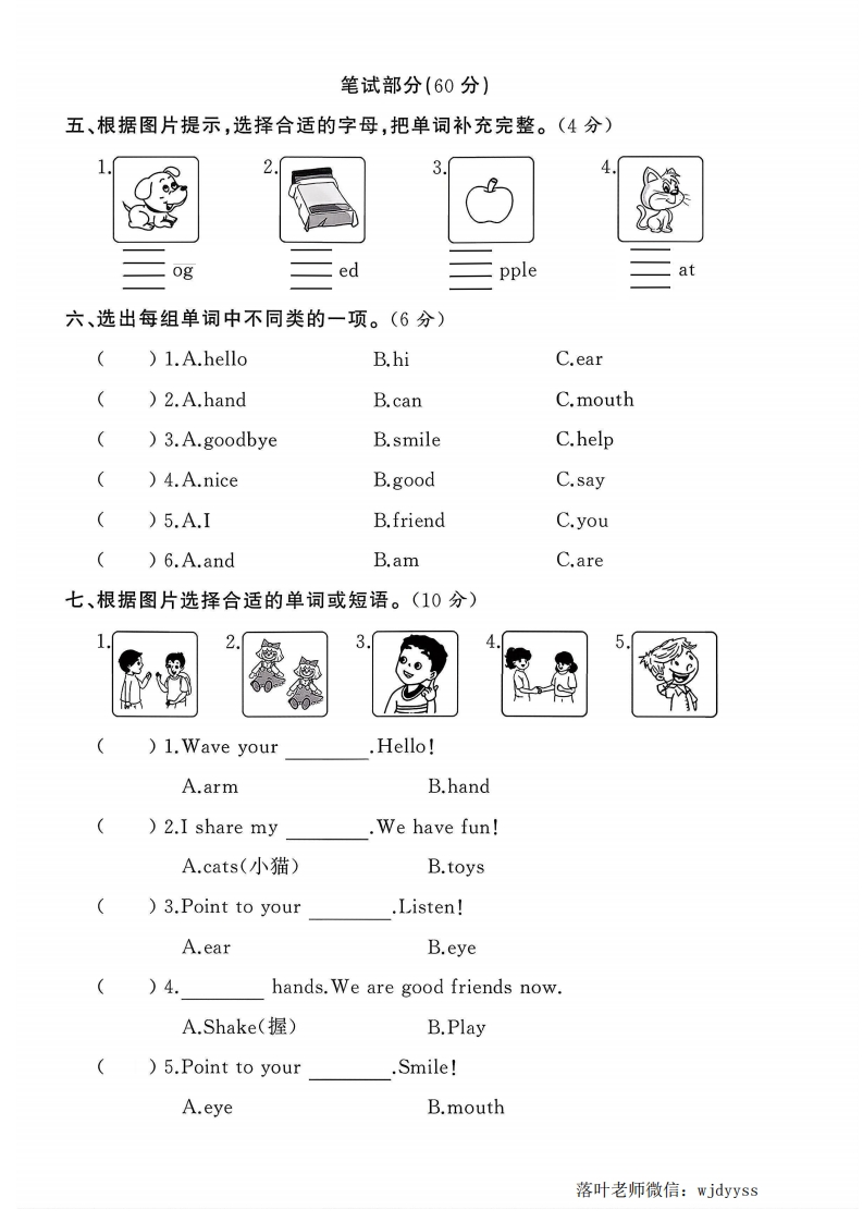 2025人教版三年级英语上册单元测试卷第一单元测试卷露检测时间:60分钟满分:100分题序三四五六七八九十一总分得分听力部分(40分)弥一、听录音,选出你与听到的字母或单词。录音听两遍。(10分)d扫码斯听力()1.A.BB.A)2.A.CB.D毁封()3.A.bB.d()4.A.aB.c()5.A.IB.my()6.A.hiB.hello线)7.A.canB.and()8.A.goodB.goodbye)9.A.helpB.friend(10.A.listenB.say内二、听录音,选出与你所听内容相符的图片。录音听两遍。(10分)BD不要1.2.3.4.5.三、听录音,判断所听内容与图片是(T)否(F)相符。录音听两遍。(10分)答3靠题四、听录音,选出正确的答语。录音听两遍。(10分)()1.A.Hello,I'm Wu Binbin.B.Hi,Mike.()2.A.Zip is my new friend.B.My name is Zoom.因()3.A.Good!B.Nice to meet you,too.()4.A.Bye!B.Hello!)5.A.Oh,no!B.Thank you!落叶老师微信:wjdyyss