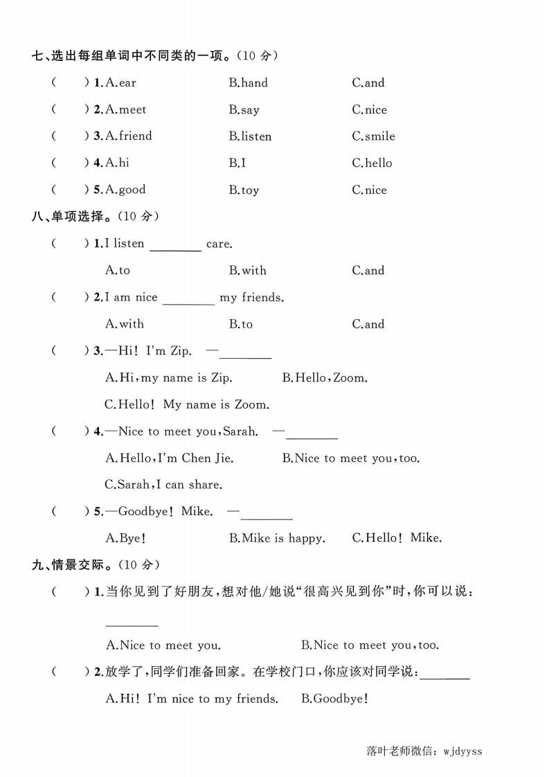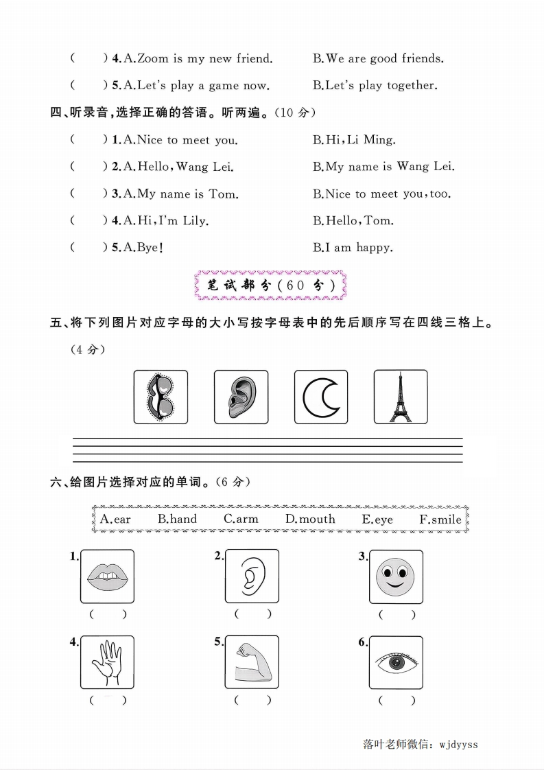 2025人教版三年级英语上册单元测试卷第一单元测试卷时间:60分钟满分:100分题序二三四五六七八九总分得分:听力部分(40分弥妇码听听力一、听录音,选出你所听到的内容。听两遍。(10分)》封()1.A.AaCeB.BbCeC.BbDd崭)2.A.niceB.nameC.meet线)3.A.shareB.smileC.say()4.A.mouthB.toyC.friend内)5.A.goodB.andC.hand二、听录音,选出与你所听内容相符的图片。听两遍。(10分)爵不)1.AB)2.AB.要)3.AB)4.AB答拟题5.A1三、听录音,选出你所听到的句子。听两遍。(10分)(B)高)电()1.A.I am a good friend.B.You are a good friend.)2.A.Thanks,SarahB.Thank you,Sarah.()3.A.I listen and help.B.I listen with care.落叶老师微信:wjdyyss