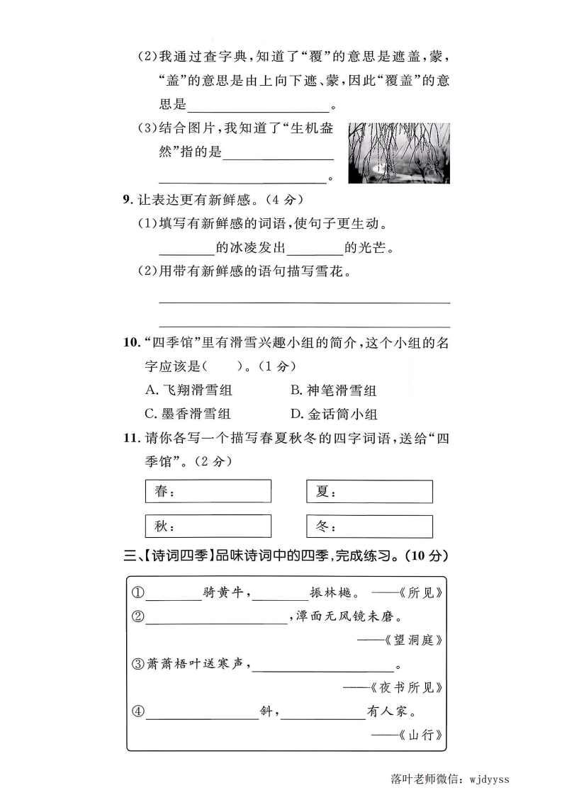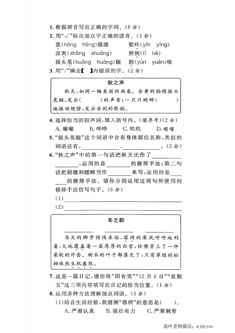 2025三年级语文上册第一次月考卷(检测范围:第一、二单元)(时间:90分钟满分:100分)评价:阳光小学一年一度的文化节开幕了!欢迎大家来到“四季馆”参观游览!一、【书写标语】抄写“四季馆”的标语,做到规范、端时正、整洁。(2分)训春有百花秋有月,夏有凉风冬有雪。二、【四季之美】赏四季风光,感人生乐趣。(34分)p製春之歌春姑娘悄悄地来了,她用温柔的shēng yin)hū()唤大地,cu zhuàng()的老树zhigàn()上长出了新叶,柳枝也随风piāo yang()着,似是在欢迎她的到来。孩条子们在山pō()上zheng()先恐后地奔跑,在Xuéxiào()里hù()相检查gong ke),一切都是那么可爱。夏之梦轰隆隆的雷声炸出了一场阵雨,雨后林间传来鸟儿的歌吟,潮【温湿】的空气都变得凉爽起来。一个穿【棕综】色长筒靴的孩子在树下照例背孙【诵俑】着古诗,摇头晃脑,韵味十足。远处两个孩子手拿冰激【凌冷】招呼他快来吃…这是夏天最美好的回忆。落叶老师微信:wjdyyss