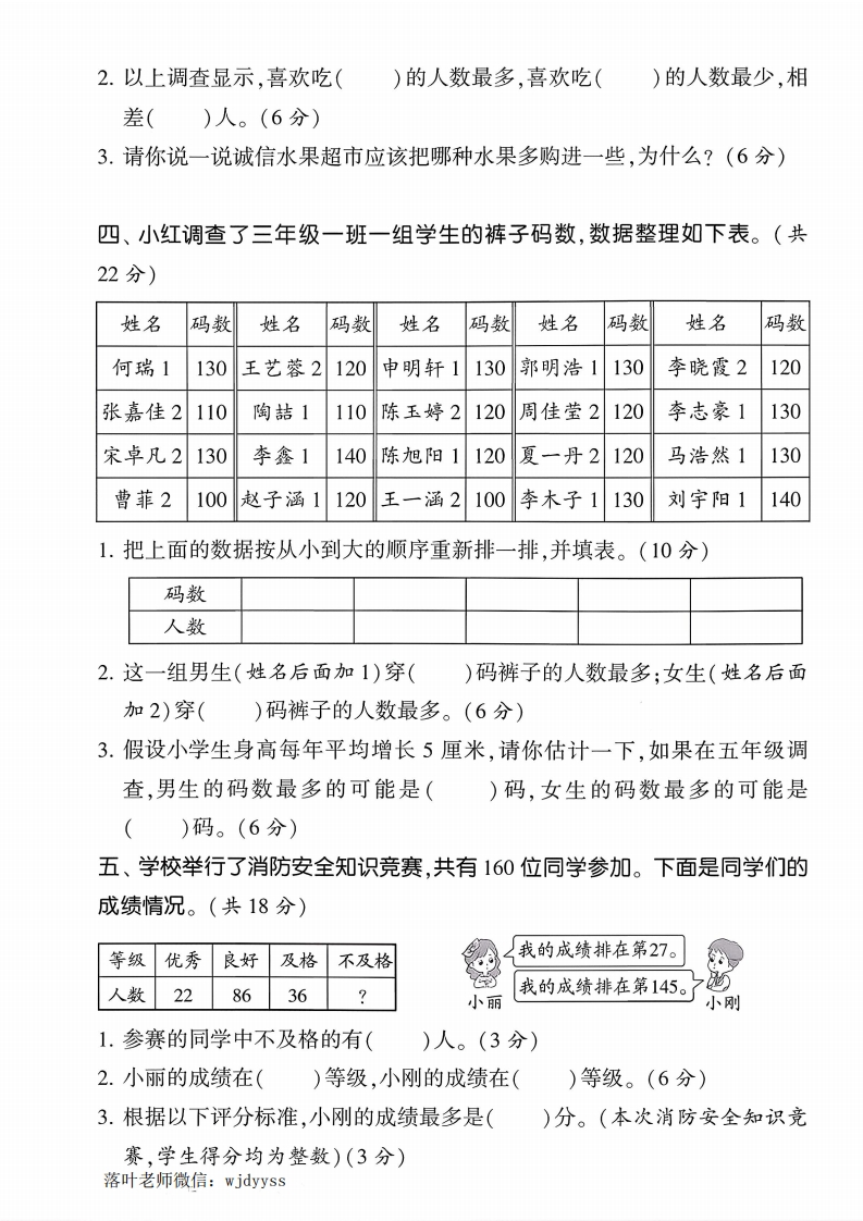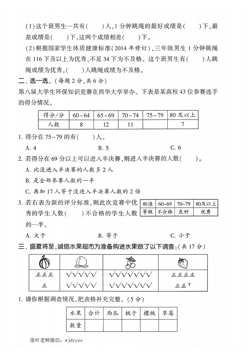 2025秋季苏教版三年级上册数学单元测试卷第三单元达标测试卷时间:60分钟满分:100+10分题序二三四五六附加题总分得分一、填一填。(每空1分,共23分)1.几个同学在统计一个路口10分钟内所通过的各种交通工具的数量。面包车大巴车小轿车摩托车正W正正下W正正W●正正(1)把他们的统计结果填在下表中。种类合计面包车大巴车小轿车摩托车辆数(2)()最多,()最少,它们相差()辆。(3)如果再观察10分钟,()通过的数量可能最多。2.如图是三年级二班学生体重的调查情况。不足16千克正(1)把他们的统计结果填入表中。16~20千克正下21~25千克正正正下体重/千克不足1616~2021~2526~30超过3026~30千克正正正人数超过30千克T(2)一共调查了()位同学。体重在()的人最多;体重在菜()的人最少。3.小华记录了全班男生1分钟跳绳的成绩,结果如下:(单位:下)89,102,134,75,68,37,145,97,51,16545,85,128,92,66,79,137,77,91,108落叶老师微信:wjdyyss
