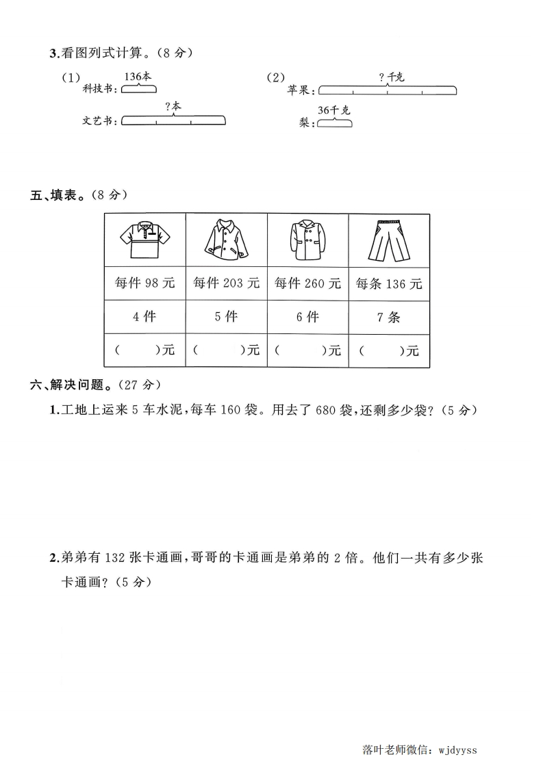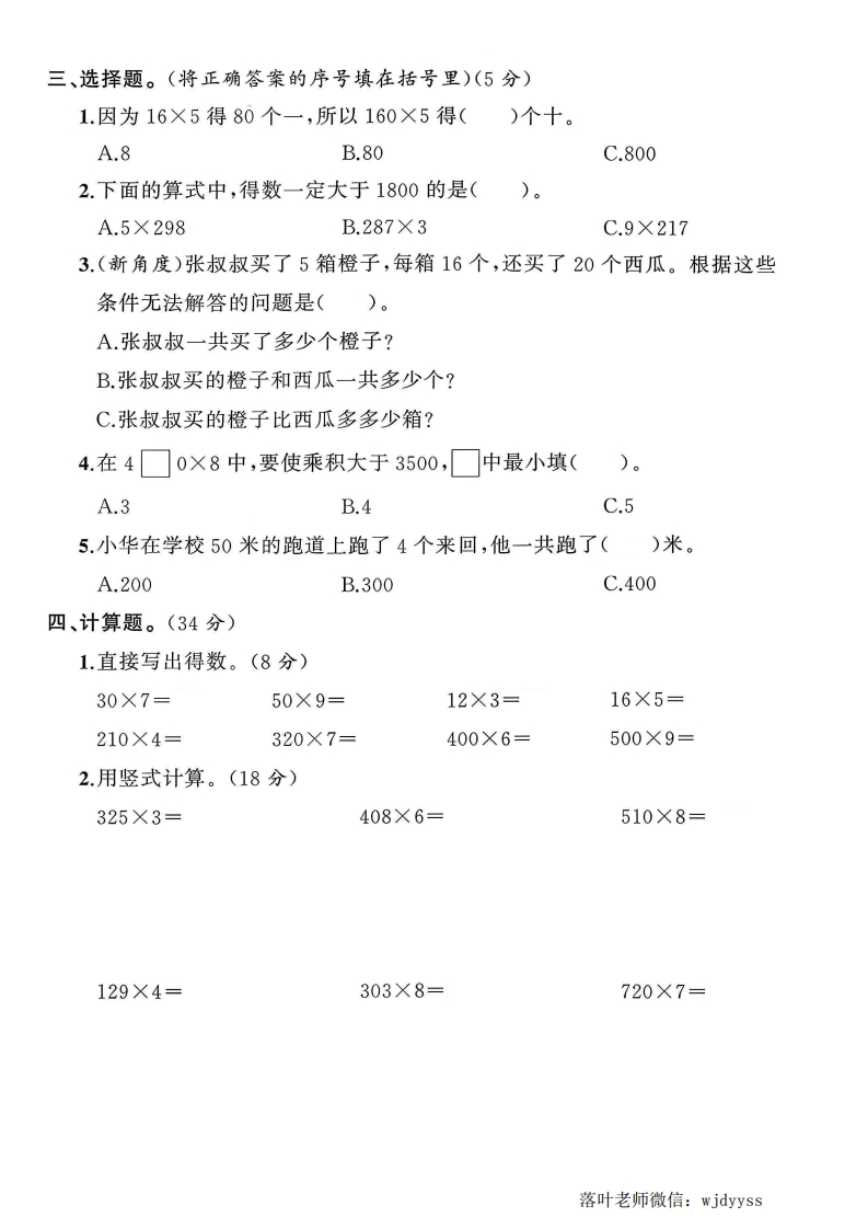 2025苏教版三年级数学上册单元测试卷第二单元测试卷时间:90分钟满分:100分+10分题序二三四五六附加题总分咖得分一、填空题。(每空1分,共21分)1.6个150的积是(),306的4倍是(弥2.750×4的积的末尾有()个0,250×3的积的末尾有()个0。13.在()里填上合适的单位。封一只蚂蚁约重1(一头奶牛约重200()毁袋食用盐约500()线4.36×2的积是()位数,3□6×4的积是()位数。5.最大的一位数与最小的三位数相乘,积是(),最大的三位数的5倍内是()。6.要使65×3的积是三位数,里最大填(),要使积是四位数,紧不里最小填()。7.学校为同学们安装护眼灯。一共有880盏,已经安装了3天,每天安装要250盏,还有()盏没有安装。8.婷婷家离学校802米,她每天中午回家吃饭。每天上学和回家婷婷大约要走(答)米。赵9.在○里填上“>”“<”或“=”。4×57○57×4240×4○420×3207×2○500题340×0○900708×3○308×730克○2千克二、判断题。(对的画“/”,错的画“X”)(5分)1.三位数乘一位数,如果乘数中间有0,那么积的中间一定有0。2.两个不为0的乘数的末尾一共有两个0,积的末尾至少有两个0。()☒楚3.今年妈妈的年龄是小军的6倍,明年妈妈的年龄还是小军的6倍。()4.280×8=280×4×2。()5.1+2+3+0<1×2×3×0。()落叶老师微信:wjdyyss