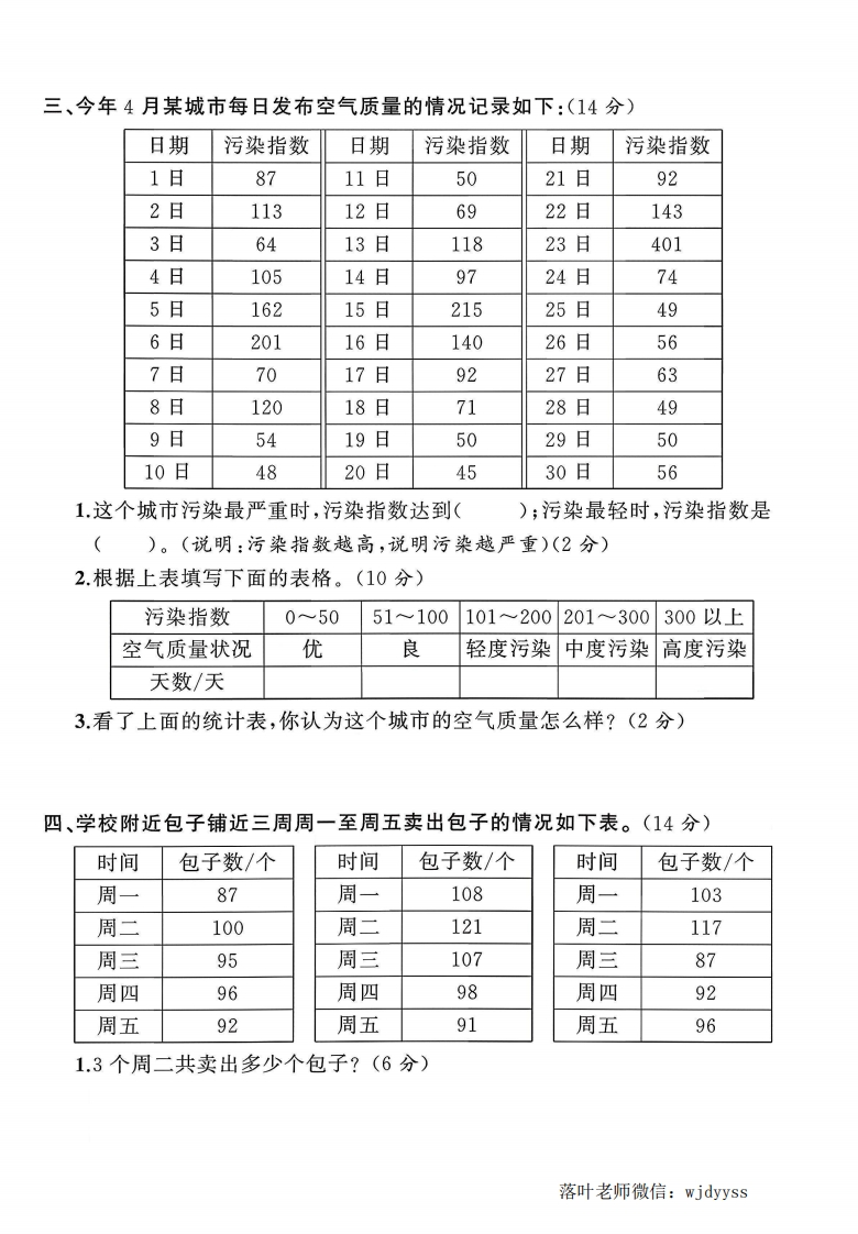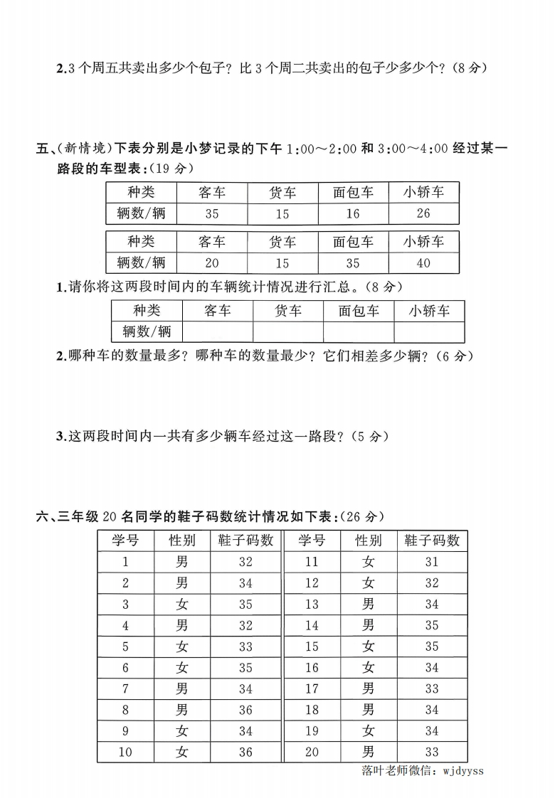 2025苏教版三年级数学上册单元测试卷第三单元测试卷时间:90分钟满分:100分+10分题序三四五六七附加题总分孙得分、小敏统计了班上10名同学一分钟脉搏跳动的次数,如下表:(8分)弥同学编号12345678910脉搏次数/次80859082888583848789封1.一分钟脉搏跳动次数最多的是()次,最少的是()次。(4分)毁2.这10名同学中,脉搏跳动次数少于84次的有()人,在84~87次范围线内的有()人。(4分)二、我国正常儿童9~10岁的体重标准如下表:(8分)内男女9岁24.3~34.0kg24.135.3kg不10岁26.8~38.7kg27.2~40.9kg下面是三(1)班第一学习小组的体重调查表:要姓名年龄体重姓名年龄体重小兰(女)9岁28.2kg小海(男)9岁35.4kg小强(男)10岁30.9kg小磊(男)9岁42.1kg靠小伟(男)10岁26.9kg小甜(女)9岁25.8kg题1.这个小组中体重最重的是()千克,体重最轻的是()千克。(2分)2.和标准体重比一比,这个小组有()名同学体重在正常范围内。(2分)3.小杰,男,10岁,体重是45千克。他的体重在正常范围内吗?你对他有什么建议?(4分)落叶老师微信:wjdyyss