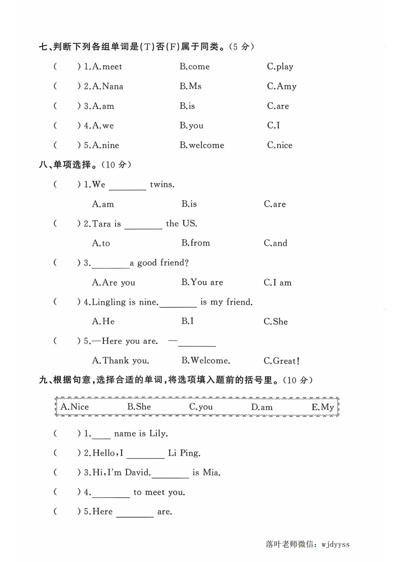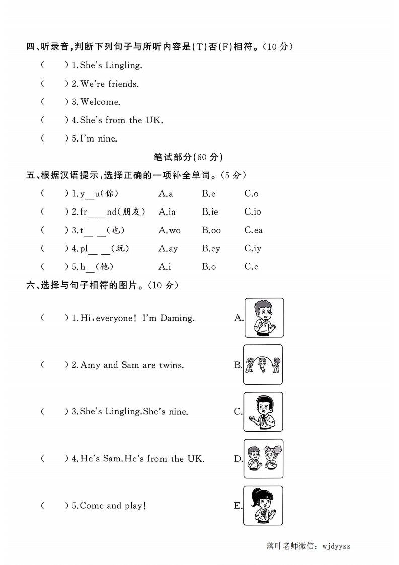 2025外研版三年级英语上册单元测试卷第一单元测试卷检测时间:60分钟满分:100分题序三四五六七八九十十一总分得分听力部分(40分)】弥一、听录音,选出你所听到的字母或单词。(10分)扫码听听力毁封()1.A.meetB.letC.nine()2.A.MmB.WwC.Vv线()3.A.sheB.heC.we内()4.A.comeB.helpC.play童不)5.A.GgB.JjC.Kk二、听录音,选出你所听到的句子。(10分)要)1.A.Let's help.B.Let's be friends.答()2.A.Tara is my friend.B.Nana is my friend.()3.A.We're from the UK.B.We're from the US.靠题)4.A.She's Yueyue.B.He's Sam.)5.A.Nice to meet you.B.Let's play together.三、听录音,用1一5的序号给下列图片排序。(10分)落叶老师微信:wjdyyss