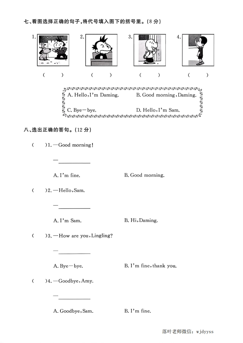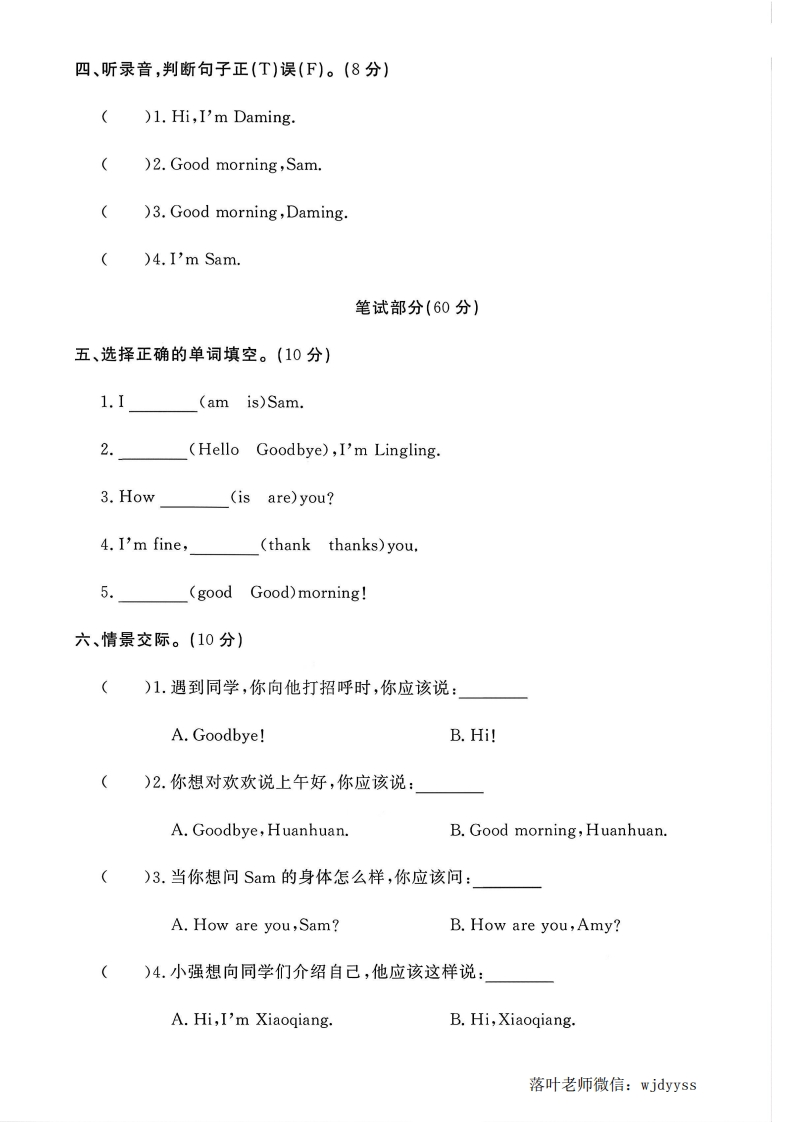2025外研版三年级英语上册单元测试卷第一单元测试卷(检测时间:60分钟满分:100分)扫码听听力器题序一二三四五六七八九十总分得分听力部分(40分)一、听录音,判断正(√)误(X)。(8分)密24.毁封线二、听录音,选择你所听到的单词或短语。(12分)内()1.A.hiB.hello()2.A.goodB.fine童不()3.A.bye-byeB.goodbye()4.A.thank youB.thanks要三、听录音,给下列图片排序。(12分)】答家题落叶老师微信:wjdyyss