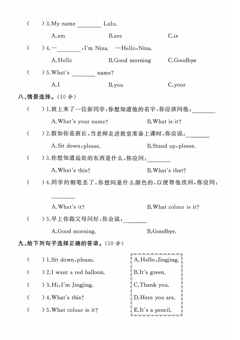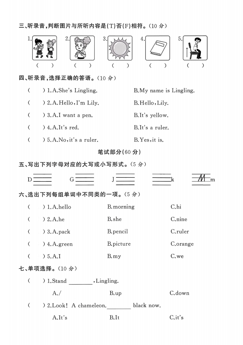 2025外研版三年级英语上册期中测试卷期中测试卷霸检测时间:60分钟满分:100分题序二三四五六七八y十一总分得分听力部分(40分】弥一、听录音,选出你所听到的单词。(10分)扫码听听力毁封()1.A.goodB.goodbyeC.book()2.A.nameB.meetC.read线()3.A.heB.sheC.we内)4.A.pencilB.rulerC.eraser()5.A.orangeB.balloonC.blue童不二、听录音,选出你所听到的内容。(10分)要()1.Ms Smart.A.Good morningB.Goodbye答()2.please.靠题A.Stand upB.Sit down()3.A.He's DamingB.She's Lingling.()4.1sa pencil?A.thisB.that()5.I want apen.A.yellowB.blue