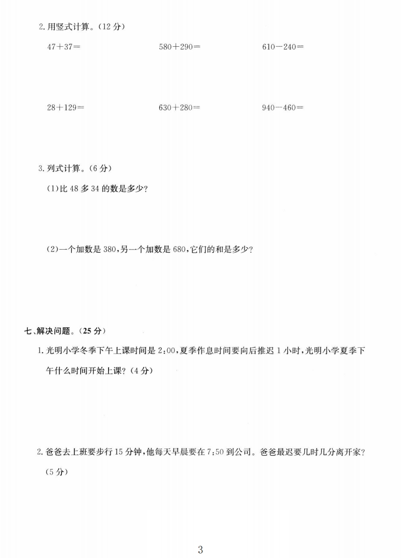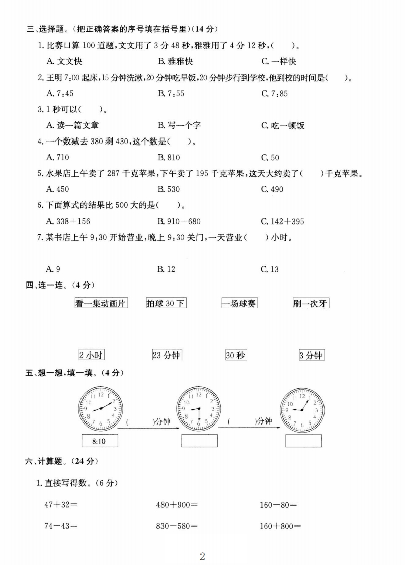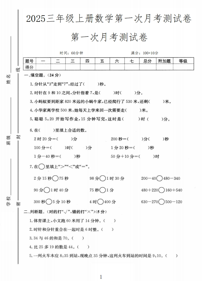 2025三年级上册数学第一次月考测试卷第一次月考测试卷时间:60分钟满分:100+10分题号四五六七总分附加题等级数得分如一、填空题。(24分)1.分针从“3”走到“7”,经过了()秒。2.时针在9和10之间,分针指着7,是()时()分。3.小蚂蚁要到距家820米远的小蜗牛家,已经爬行了530米,还剩()米。4.小华家离学校500米,她每天上学来回一次需要走()米。5.聪聪5:20开始写作业,15分钟写完,这时是()时()分6.在()里填上合适的数。南2时20分=()分200秒=()分()秒常100分=()时()分1分20秒=()秒1分-40秒=()秒50分+10分=()时7.在○里填上“>”“<”或“=”。2分15秒○75秒98分○1时30分200-40○480-34090分○1时40分75秒○1分480+220○160+540这期300秒(○5分10秒4时○400分630-270○500-120二、判断题。(对的打“/”,错的打“×”)(5分)1.体育课上,小文跑60米用了14分钟。()2.时针和分针重合在一起时是6时整。()3.34与46的和是70。()4.比25多19的数是44。()5.一列火车本应8:35到站,现晚点35分钟,这列火车到站的时间是9:10。()1