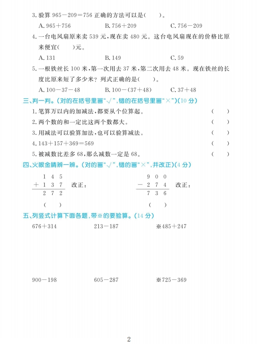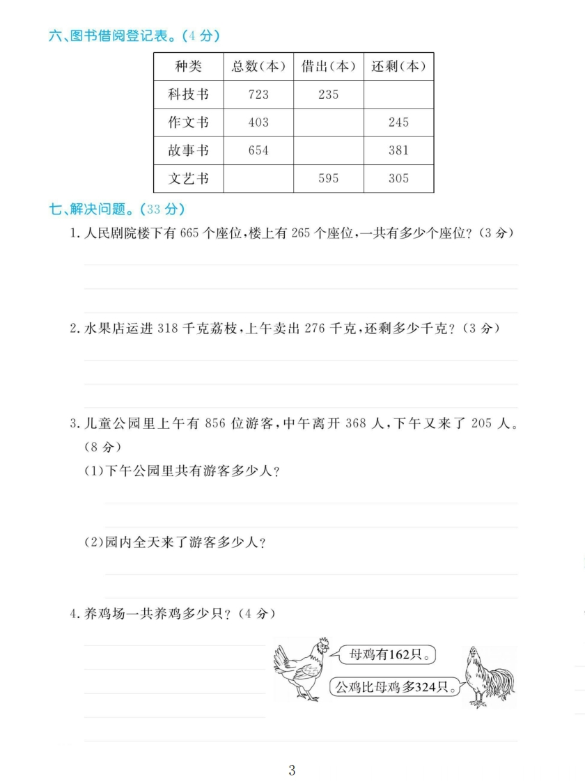 2025人教版三年级数学上册第四单元测试卷第四单元测试卷时间:60分钟满分:100分器题号二四五六七附加题总分得分一、填一填。(25分)密1.两个三位数相加,它们的和可能是()位数,也有可能是(位数。毁封2.429比789少();比659多126的数是(3.用6、4、8组成的三位数中,最大的数比最小的数大(线4.下列哪些算式的结果小于600?在括号里画“√”。352+295()186+452(102+497(内925-328()705-102()725-107(5.在○里填上“>”“<”或“=”。童不200+699900600(1000-452要514-28(○405+52152+29○152-296.在括号里填上适当的数。答813-()=74()-213=43068+()=216701-()=95()+74=314346+()=758靠题7.把下列算式按得数的大小,从大到小排列。603-32556+731900-409498+504()>()>()>()二、选一选。(把正确答案的序号填在括号里)(10分)1.下面两个数相加得1000的是()。A.536和361B.649和341C.792和208☒2.得数比600大的算式是()eA.189+419B.301+297C.952-3631