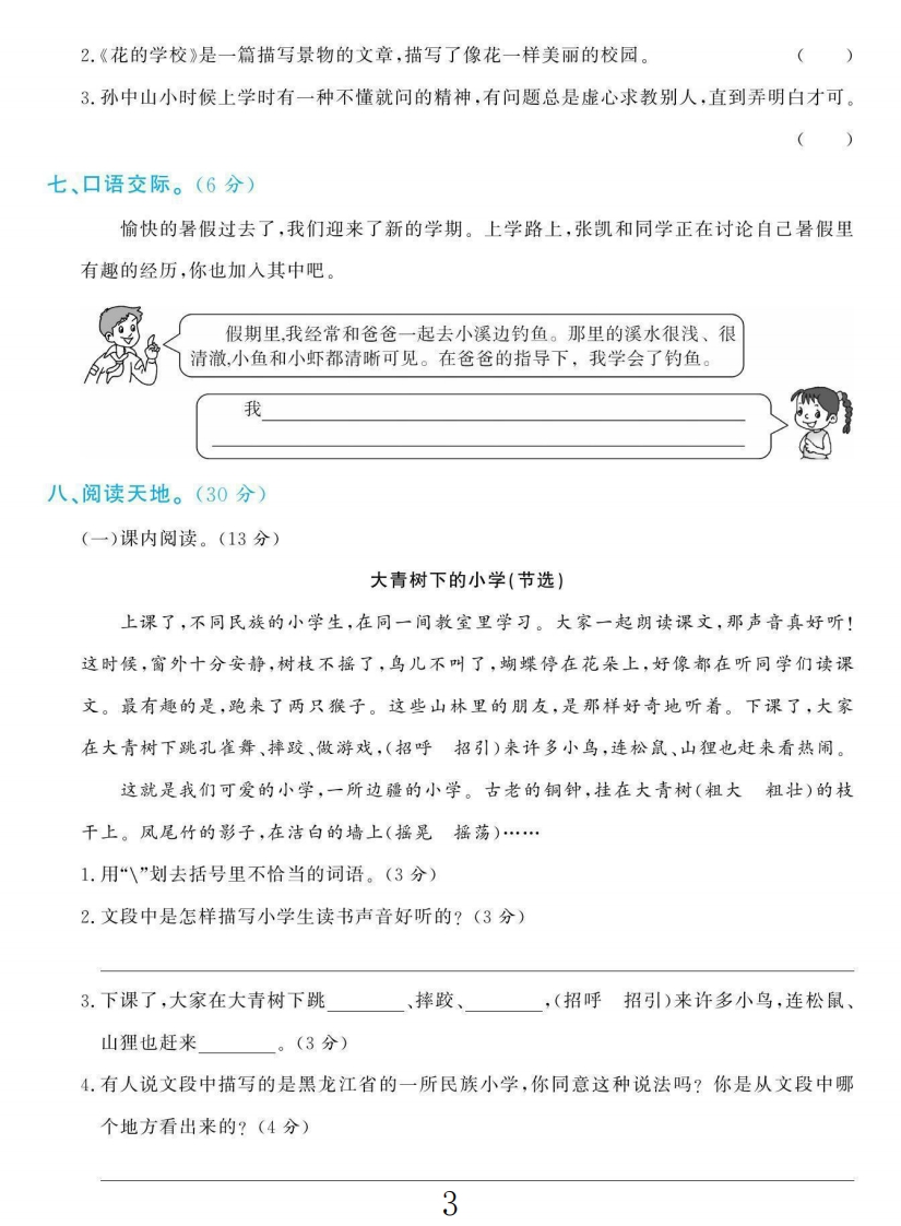 2025-2026学年三年级语文上册第一单元测试卷第一单元测试卷时间:60分钟满分:100分题号二三四五六七八九总分得分美丽的校园,是我们成长的摇篮,也是我们梦想启航的地方。你的校园是什么样的呢?在那里又发生过哪些难忘的事呢?就让我们开启这一次的校园之旅吧!一、读拼音,写词语。(7分)zao chenfu zhuangchang di同学们都穿着统一的在声中,gao yangshǒubitiàowusuǒyǒu着开心地,好像的烦恼都忘掉了一样二、选出每组中读音不正确的一项。(4分)1.A.树枝shùzhiB.好奇hao aiC.招引zao yinD.影子ying zi2.A.阵雨zhènyǔB.自然zhi ranC.能够neng gòuD.摔跤shuai jiao3.A.落后IuòhòuB.课堂kètangC.认真ren zenD.值得zhidé4.A.处罚chǔfdB.读书d0shuC.座位zhuòweiD.意思yisi三、填序号。(4分)右图是“扬”字在字典中的解释。“向高高飘扬的国旗敬扬:①高举,往上升;②在空中飘礼”中的“扬”应选第种解释,“老师表扬了我”中动:③往上撒:④传播出去。的“扬”应选第种解释。1