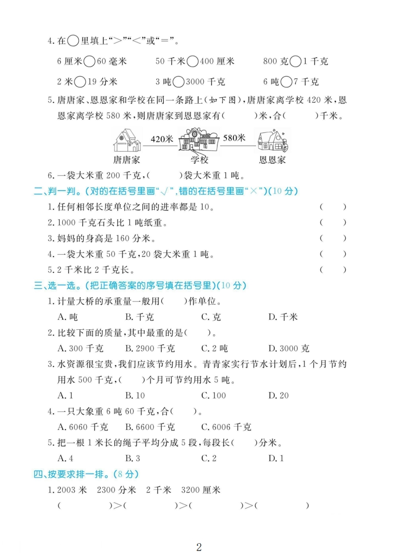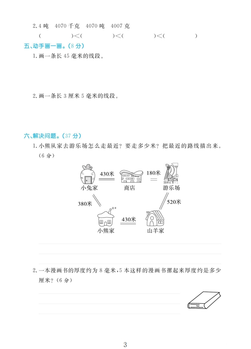 2025三年级上册数学第三单元测试卷第三单元测试卷时间:60分钟满分:100分题号二三四五六附加题总分孙得分一、填一填。(27分)F()厘米()毫米)厘米()毫米救2.在括号里填上适当的单位。橡皮00棵大树高约马拉松长跑比赛全长一块橡皮长约10(约42()。4(杀尝食用油细桶食用油重枚曲别针重约一头牛的体重约5()。2()。250(3.在括号里填上合适的数。3000千克=()吨15千米=()米逊20毫米=()厘米80厘米=()毫米1吨一500千克=()千克70厘米+50厘米=()分米2吨+800千克=()千克33毫米+37毫米=()厘米1