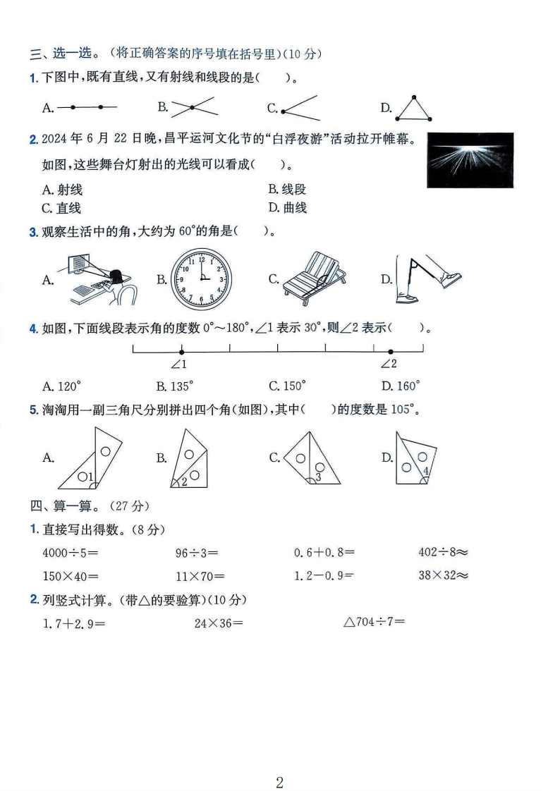 2025四年级上册数学第三单元测试卷时间:60分钟满分:100分一、填一填。(每空1分,共19分)上面的图形中,线段有()条,射线有()条,直线有()条。2.过一点可以画()条直线,经过两点可以画()条直线。3.钟面上2时整,时针与分针形成的角是()°;4时30分,时针与分针形成的角是()角。4.淘淘用量角器测量一个角时,角的一条边和外圈的0°刻度线重合,读数时他读成了内圈的刻度,读出的度数为45°,实际这个角的度数是()°。5.如果∠1+15°是一个直角,那么∠1=()°,∠1是一个()角如果∠2+75是一个平角,那么∠2=()°,∠2是一个()角。6.看图数一数,共有()个角,其中有()个锐角,()个直角,()个钝角。→+△第6题图第7题图第8题图7.如图,将一张半圆形的纸对折两次后,得到的角是()°。8.如图,将一副三角尺放在一张长方形纸上,则∠1=()°,∠2=()°。二、辨一辨。(对的画“/”,错的画“×”)(5分)1.依依画了一条14厘米长的线段。(2.在直线、射线、线段中,直线最长,射线较长,线段最短。3.角的两边越长,角的度数越大。4.在一个能放大5倍的放大镜下看20°的角,看到的角是100°。5.钝角比直角大,比直角大的角一定是钝角。(1