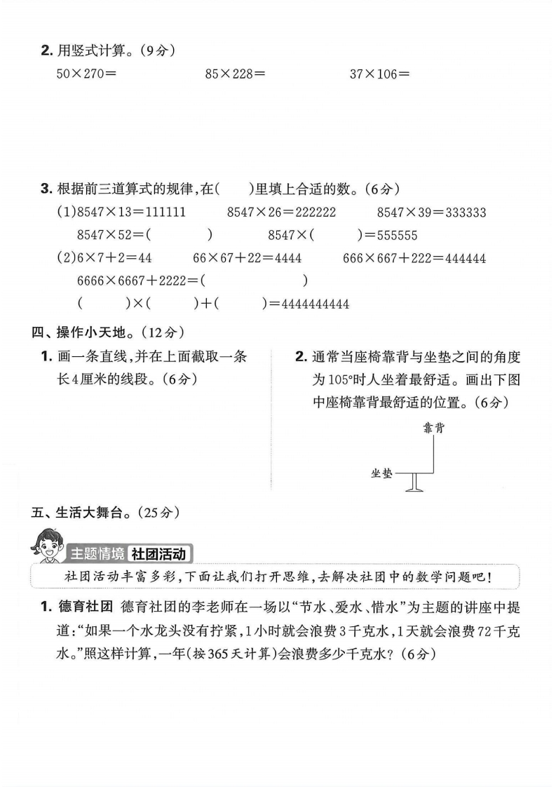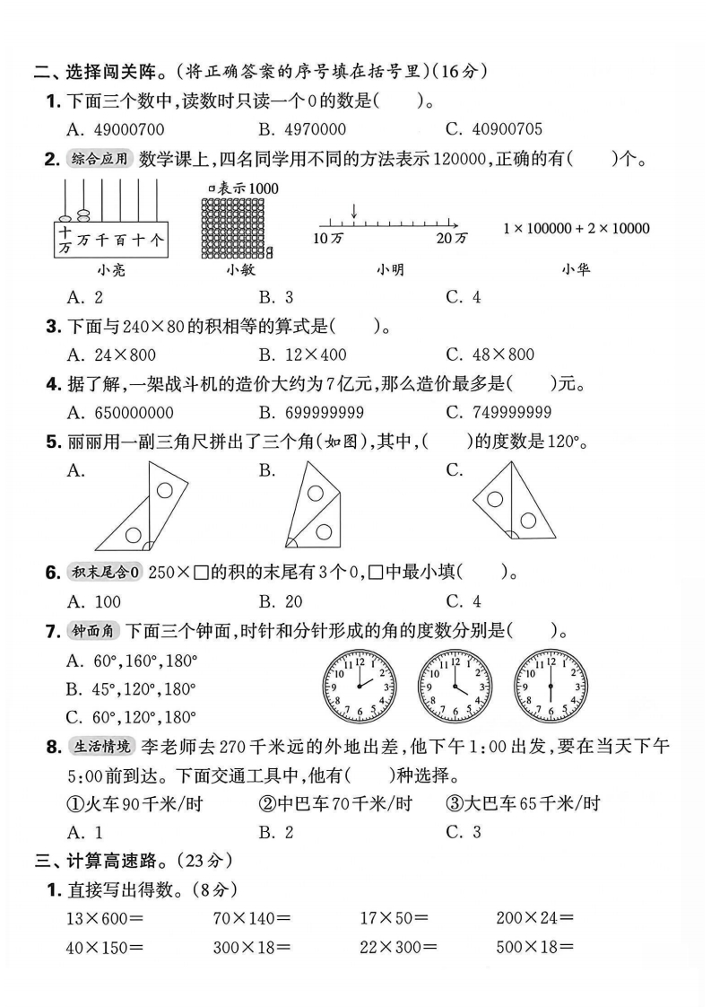 2025-2026学年人教版四年级上册数学期中评估卷数学期中评估卷时间:90分钟满分:100+10分一、填空智慧园。(每空1分,共24分)1.2025年“五一”假期,北京市共接待游客总量17908000人次,实现旅游总花费都二百零九亿八千万元,创历史同期新高。横线上的数省略万位后面的尾数是()万;波浪线上的数写作(),四舍五人到亿位是()亿。2.67口809≈68万,☐里最小填();如果235X口2的积是五位数,那么口里最小填()3.数学实践课上,晓晓和同学们想知道1亿张A4纸摞起来有多厚。他们采用“化繁为简”的方法,先测量出100张A4纸大约厚1厘米,然后推算出一万张A4纸大约厚()米,再推算出1亿张A4纸大约厚()千米。4.〔郑州市期末)在()里填上合适的数或单位。(1)“鸟巢”的占地面积约为20公顷,合()平方米。窗(2)晓晓骑车从家到游泳馆大约需要5分钟,已知她骑车每分钟大约行240米,她骑车的速度可以写作240()。游泳馆的占地面积大约为23000(),一个游泳池长100米,宽50米,()个这样的游泳池的占地毁面积是1公顷。5.如图,如果∠1=55°,∠3=∠1,那么∠2=()°。376.两个因数的积是105,如果一个因数不变,另一个因数乘30,那么积是(7.在○里填上“>”“<”或“=”。999999○10000076952300○769862003亿○130000000045×120○450×126平方千米○5999公顷6平方千米5公顷○605公顷8.数线段右图中有()条线段,()条射线。9.错中求解小明在做三位数乘两位数的计算题时,把两位数30个位上的0看成了童6,乘得的积比正确的积多1080,正确的积是()10.〔开封市期未)删数字组数从多位数2843919405中去掉4个数字,使剩下的6个数字(顺序不变)组成一个六位数。这个六位数最大是(),最小是()