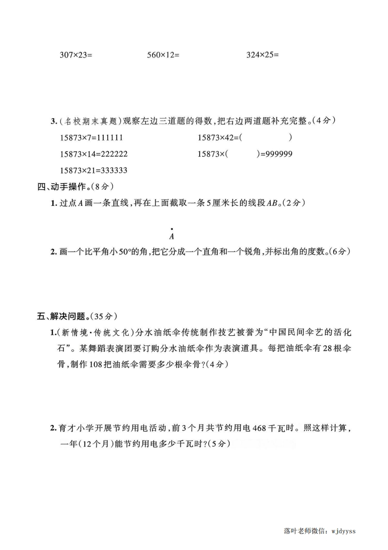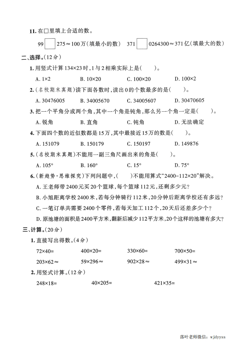 2025-2026学年人教版四年级上册数学综合素养评价期中试卷时间:90分钟满分:100分题序三四五总分等级n蜘得分一、填空。(每空1分,共25分)1.(名校期末真题)一个十位数,最高位上是6,百万位和百位上都是5,其他数位上都是最小的自然数,这个数写作(),读作(),这个数的最高位是()位,省略亿位后面的尾数约是()亿。2.在()里填上适当的面积单位。广州市的面积约7434()。足球场的面积约是7000(K)。製手指甲的面积约是1()。国家体育场的占地面积约为20(3.两个因数的积是140,若一个因数不变,另一个因数乘20,则积是(4.一辆汽车的速度是75千米/时,这辆汽车4小时可行驶()千米。5.如图所示,已知∠2=35°,那么∠1=()°,∠3=()°,∠4=()°。6.(教材改编)花园小学阅览室的面积约100平方米,()个这样的阅览室面箭都积约是1公顷。100个花园小学校园的面积约是1平方千米,花园小学校园的面积约是()公顷。7.在O里填上“>”“<”或“=”。杯18万18050030×19019×30011平方千米99000平方米8.(名校期末真题)两个锐角的度数和是135°,那么其中较大的角一定小于()°,较小的角一定大于()°。总9.(新情境·生活运用)随着短视频的盛行,小明拍摄了一段时长134秒的视频,如果1秒播放12帧(zhēn)画面,这段视频一共要播放()帧画面。10.☐42×33,若积是四位数,☐里最大填();若积是五位数,口里最小填(落叶老师微信:wjdyyss