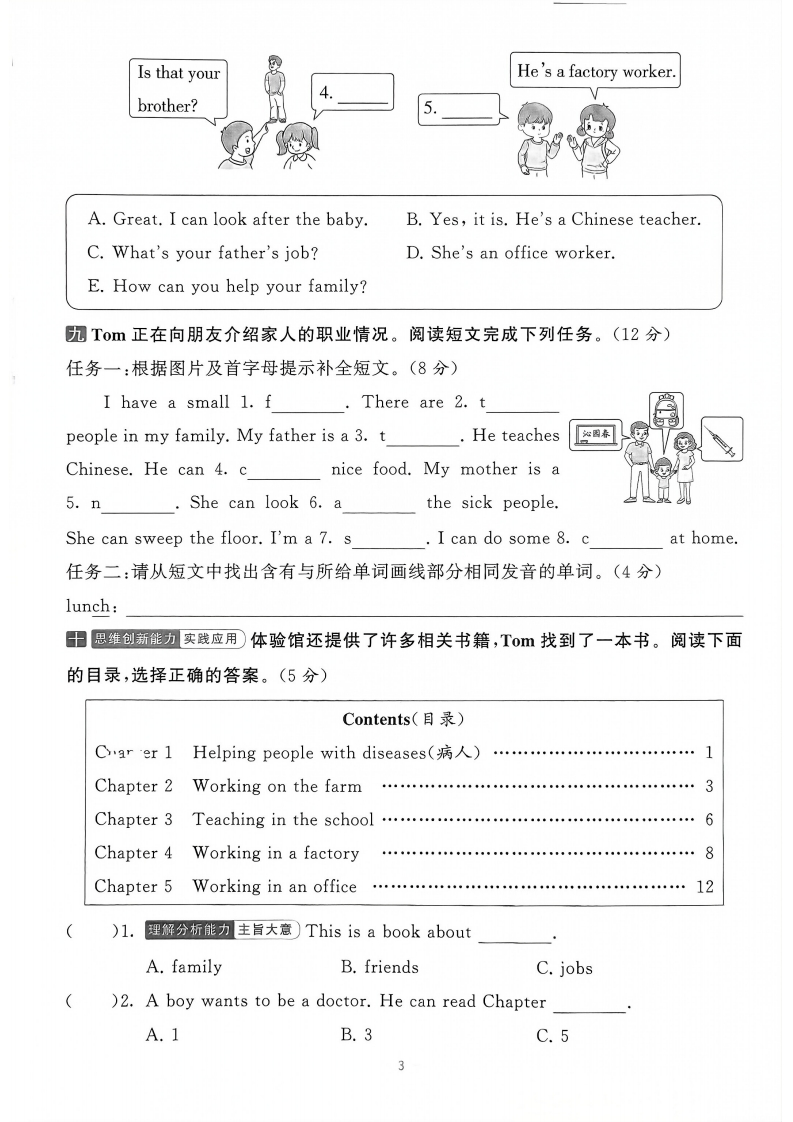 2025-2026学年人教版四年级上册英语素养达标卷Unit1素养达标卷时间:60分钟满分:100分叮咚!欢迎来到职业体验馆。这里有许多神奇有趣的职业等你体验,一起来看$看吧!听力部分(50分)□听录音,选出你所听到的句子中所包含的单词。(听两遍,10分))1.A.choreB.cookC.clean器弥()2.A.farmerB.factoryC.floor)3.A.helpfulB.peopleC.job)4.A.officeB.alsoC.after)5.A.sweepB.nurseC.worker毁□听录音,给下列图片排序。(听两遍,10分)目听录音,选择你所听到的句子。(听两遍,10分))1.A.She can do some chores.B.He can sweep the floor.)2.A.You have a big family.B.I have a happy family.线)3.A.We cook together.B.We have fun.)4.A.I look after my doggy.B.I cook for my family.)5.A.He's a factory worker.B.She's an office worker.四听录音,选择正确的答语。(听两遍,10分))1.A.Yes,it is.B.He's Tim.)2.A.She's a doctor.B.He's a teacher.)3.A.We can make a gift.B.She can clean the room.)4.A.He can sweep the floor.B.She can look after her sister.)5.A.I can cook for my mum.B.I often talk with my family.1