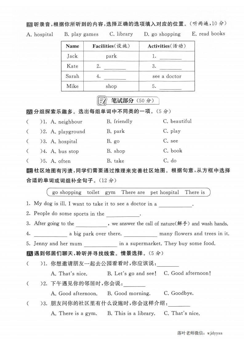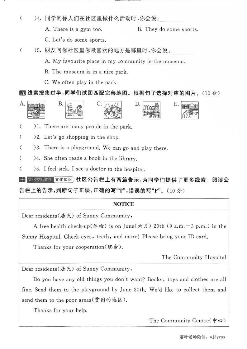2025-2026学年人教版四年级上册英语素养达标卷Unit3素养达标卷时间:60分钟满分:100分Sumy社区举办“社区探索日”,邀请各位小朋友一起深入了解社区的功能与生活!听力部分(50分)一听录音,圈出与你所听到的内容相符的图片。(听两遍,12分)1.AB2.A.B.4园Q金回弥3.A.4.A.B5.A.B.6.A.B毁□听录音,选出你所听到的句子。(听两遍,10分)封)1.A.There is a hospital.B.There is also a playground.()2.A.Good afternoon.B.Good morning.)3.A.I often play there with friends.B.I often play football here.)4.A.There are many people.B.There are so many books.)5.A.Let's do some sports.B.Let's take a walk.线旦听录音,勾选出你所听到的地点。(听两遍,8分)6*馆06四听录音,判断图片与所听内容是(T)否(F)相符。(听两遍,10分)2.5.落叶老师微信:wjdyyss