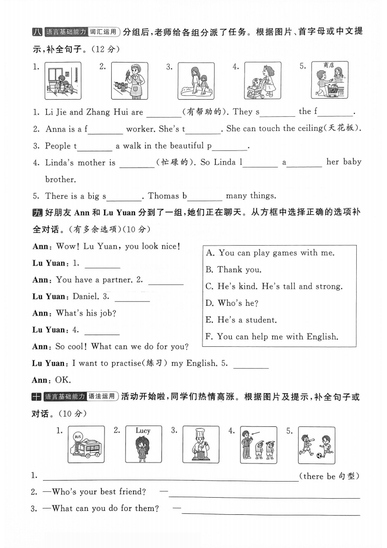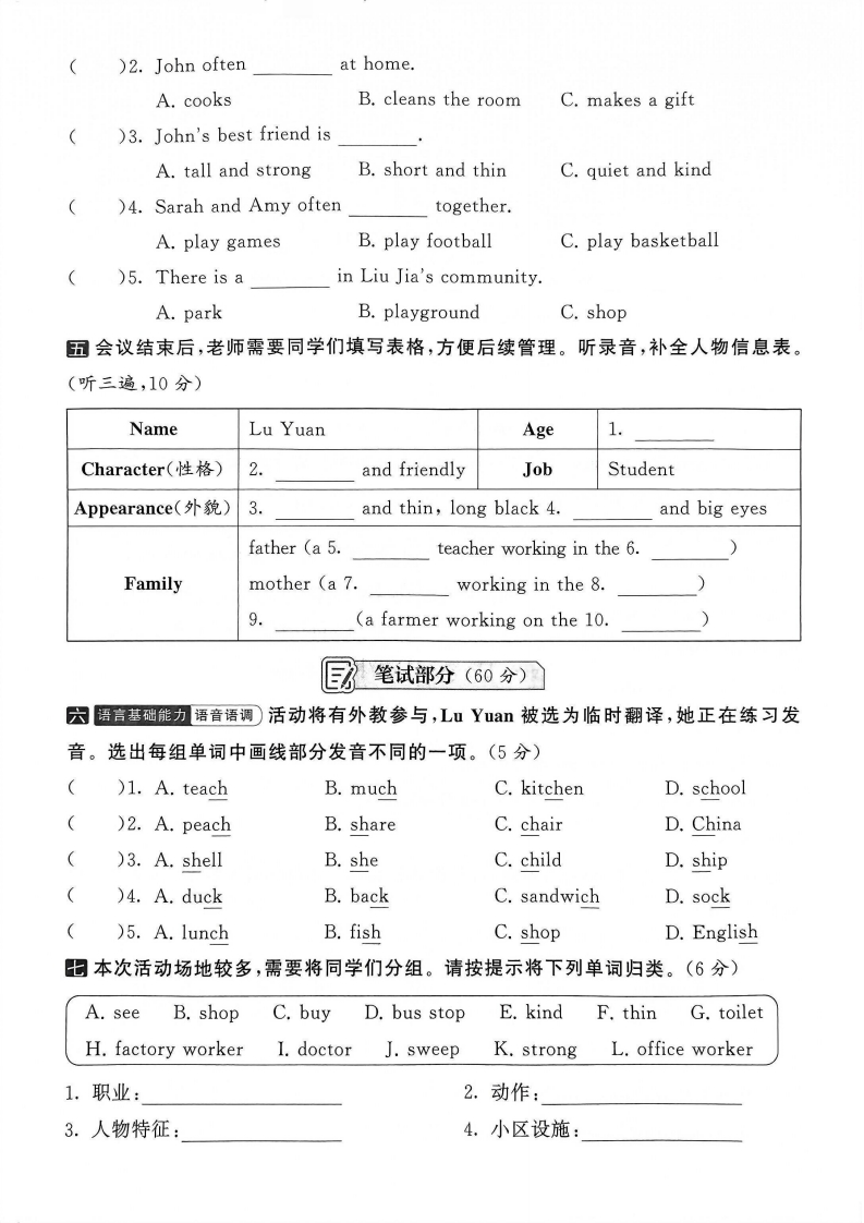 2025-2026学年人教版四年级上册英语素养达标卷期中试卷时间:60分钟满分:100分学校计划组织爱心义卖,老师和同学们觉得可以到社区推广,号召大家一起行动,Lu Yuan就是其中一员,他们都做了些什么呢?肿听力部分(40分)□Lu Yuan来参加动员会议,会议还没开始,大家都在聊天。听录音,选择你所听到的选项补全句子。(听两遍,5分)环弥)1.Li Lei is veryA.kindB.quiet()2.There is aA.big parkB.small toilet)3.My friend isA.short and thinB.tall and thin()4.He has niceA.long hairB.short hair毁)5.Wefor our family.A.sweep the floorB.look after my sister封□动员会议开始啦,老师正在介绍活动相关场所。听录音,给下列图片排序。(听两遍,5分)目参会的同学和家长听完后有许多问题想要讨论。听录音,选择正确的答语。(听两线遍,10分)()1.A.She's an office worker.B.He's a factory worker.)2.A.He can do some chores.B.We can clean the room.)3.A.His name is Zhang Peng.B.Her name is Amy.()4.A.Chen JieB.She's funny.)5.A.Good afternoon!B.Good morning!四中场休息,大家正在闲谈。听录音,根据对话内容选择正确答案。(听两遍,10分))1.Mike's mother is a(n)A.nurseB.doctorC.office worker