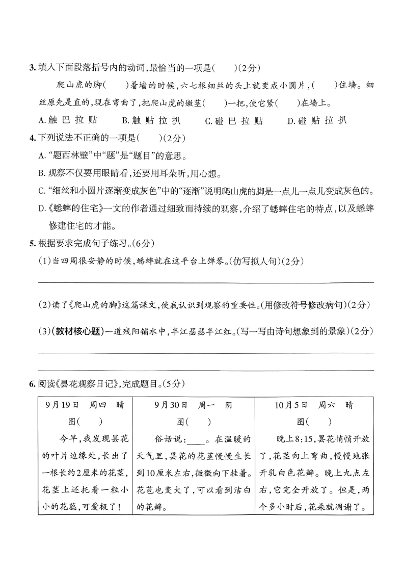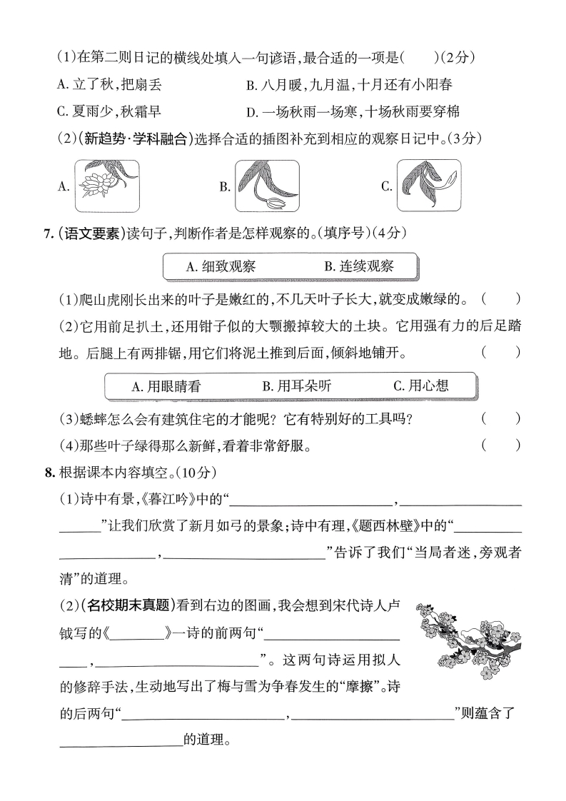 2025-2026学年四年级上册语文情境素养卷第三单元情境素养卷:时间:90分钟满分:100分处处留心皆学问。观察是我们的好老师,连续细致的观察会让我们打开新的眼界,拥有新的认知。现在,让我们走进观察的世界,感受观察的魅力吧。弥活动一:学会观察,积累基础知识孙1.(新趋势·语段综合)下面是小语在本单元学习中的部分总结,请阅读并完成练习.(13分)心中有诗意,万物皆可爱。蟋蟀是一位建筑专家,它并不寻找临时的隐蔽所藏身,而是会shen zhong地Xuǎnzé合适的zhùzhi。当你循着一些hénji去搜(shou ssou)索它的巢穴时,你会发现有一条倾(qin qing)斜的隧道,隧道顺着地势弯弯曲(q0qǔ)曲的,有时降(jiàng xiang)下雨水,这里也能立刻变千。戡爬山虎也很有趣。它的叶子总是j加nyun地铺在墙上,没有chong dieé起来的,远封远望去不留一点儿kòngi。茎上长叶柄(bin bing)的地方,反面的细丝就是爬山虎的脚,长得非常可爱,不逊(sùnùn)色于蜗牛的触角。(1)根据语段中的拼音,依次在田字格中写词语。(7分)》:(2)在语段的括号中选择加点字的正确读音,打“√”。(3分)(3)文中画线的“临”字用音序查字法,应先查音序再查音节;用部线首查字法,应先查部,再查画。“临”在字典中的意思有:①到,来;②挨着,靠近;③照着字、画模仿。语段中的“临”字应选择第种解释,“临摹练习”中的“临”应选择第种解释。(3分)孤2.(名校期末真题)下列动物的“家”的名称完全正确的一项是()(2分)A.狗洞鸡窝虎穴B.鸟巢猪圈鱼塘C.羊圈猪棚鼠厩D.鸟巢马厩牛穴