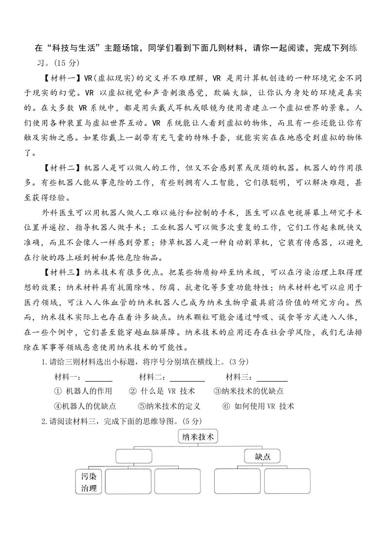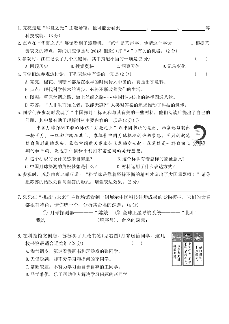 2025-2026学年四年级上册语文情境主题卷第一次月考卷时间:90分钟满分:100分国庆期间,四年级()班组织了研学活动。让我们跟着他们的步伐,一起去看看吧!第一站亲近自然,打卡“童话村”阅读语段,按要求完成练习。(18分)90后小伙尚勤杰,用一支画笔把自己的家乡小屯村变成童趣yángy10的“童话村”。他笔下的wandòu()绿意盈盈,pútao()晶莹剔透,shu I dào()闪闪发光,wén()虫栩栩如生…他用心yánjiū(),凭借一双巧手让平凡的小村子“火”了起来。他妙笔生花绘诗意,被大家称为“”,还céng0被我国外交部领导人点赞。如今,尚勤杰想做一个奔跑在田园的“野生”壁画师,把墙画美,把日子过美。1.根据拼音在括号里写字词。(6分)2.读语段最后一句话,“把墙画美”中“美”的意思是0,“把日子过美”中“美”的意思是()。(4分)A.美丽:好看(跟“丑”相对)B.使美丽C.令人满意的:好D.美好的事物:好事3.语段中,“栩栩如生”一词的意思是。我还可以用等四字词语来夸赞尚勤杰的作品。(3分)4.想一想:尚勤杰会被大家称为什么?填在语段横线处。(2分)5.亮亮想在朋友圈发表一句夸赞尚勤杰的话,请你帮他写一写。(3分)第二站亲近科学,打卡科技馆读科技馆的场馆简介,完成练习。(19分)主要场馆主要展览内容华夏之光展示中国古代光辉灿烂的科技成就探索与发现展示近代以来在基础科学领域的探索与发现成果科技与生活展示现代科技对人们日常生活的影响与改变挑战与未来展示人类面临的重大问题与挑战和对未来生活的畅想