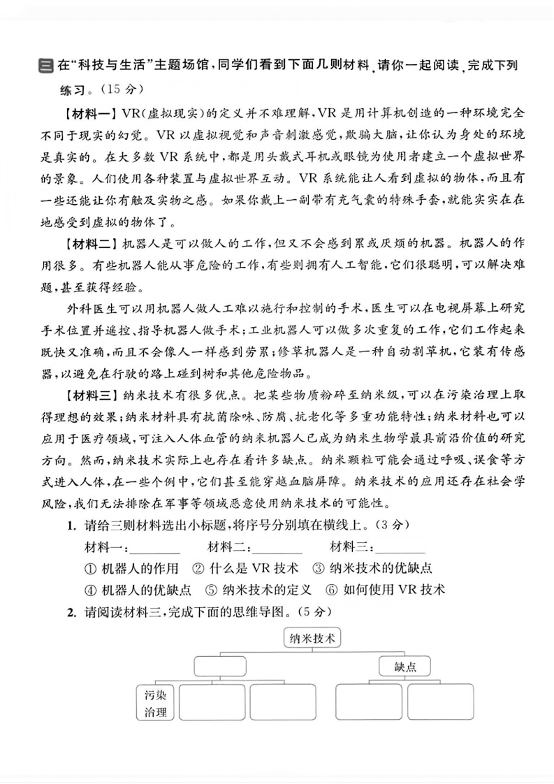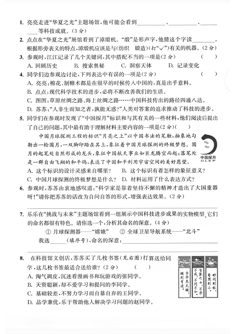 2025-2026学年四年级上册语文情境主题卷第一次月考卷时间:90分钟满分:100分国庆期间,四年级(1)班组织了研学活动。让我们跟着他们的步伐,一起去看看吧!。第一站亲近自然,打卡“童话村”。□阅读语段,按要求完成练习。(18分)90后小伙尚勤杰,用一支画笔把自己的家乡小屯村变成童趣yang yi()的“童话村”。他笔下的wandòu()绿意盈盈,púta0()晶莹别透,shui dào的()闪闪发光,wen()虫棚棚如生…他用心ynjiū(),凭借一双巧手让平凡的小村子“火”了起来。他妙笔生花绘诗意,被大家称为“”,还ceng毁()被我国外交部领导人点资。如今,尚勤杰想做一个奔跑在田园的“野生”壁画师,把墙画美,把日子过美。1.根据拼音在括号里写字词。(6分)2.读语段最后一句话,“把墙画美”中“美”的意思是(),“把日子过美”中“美”的即意思是()。(4分)A.美丽;好看(跟“丑”相对)B.使美丽C.令人满意的;好D.美好的事物:好事3.语段中,“栩栩如生”一词的意思是我还可以用等四字词语来夸赞尚勤杰的作品。(3分)4.想一想:尚勤杰会被大家称为什么?填在语段横线处。(2分)5.亮亮想在朋友圈发表一句夸赞尚勤杰的话,请你帮他写一写。(3分)●第二站亲近科学,打卡科技馆读科技馆的场馆简介,完成练习。(19分)主要场馆主要展览内容华夏之光展示中国古代光辉灿烂的科技成就探索与发现展示近代以来在基础科学领城的探索与发现成果科技与生活展示现代科技对人们日常生活的影响与改变挑战与未来展示人类面临的重大问题与挑战和对未来生活的畅想