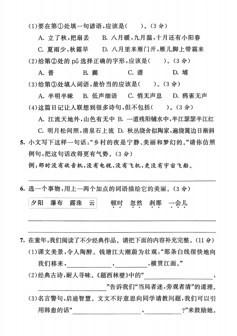 2025-2026学年四年级上册语文期中测试卷语文期中试卷时间:90分钟满分:100分骆让我们一起参与缤纷童年,多彩生活主题活动,体验童年的精彩!新一、【活动一记录生活,分享美好。(41分)1.根据拼音写词语,补全下面的畅想感言。(6分)畅想童年,一件件趣事y6ur心()春雨zirùn()我们的心灵,带给我们成长与gibiàn()。我们在泥地里踩水坑,一会儿gong fu()就把裤脚弄脏了;我们在田野里嬉戏,脸上翰yang yi()着灿烂的笑容。请xuǎnz()自己喜欢的方式和大家分享童年的快乐吧!2.同学们提到一些词语,加点字读音有误的一项是()。(3分)A.潜人(qian)倾斜(qing)B.薄雾(b6)叶柄(bing)C.霎时(sà)氛围(fn)D.坠落(zhui)骤雨(zhòu)3.活动记录用到的词语中有错别字的一项是()。(3分)A.慎重重叠B.茂盛痕迹C.既然余波D.奥秘滕云驾雾4.小语同学写了一则观察日记,请你给她提提建议。(12分)源10月11日星期六晴虽然已入秋,但是天气还是这么暖,真是(①)。傍晚,夕阳的光柔和地铺在江面上,绚丽极了。一阵清香扑鼻而来,原来是花心馨(②)里的菊花开了。夕阳西下,天色渐暗,月亮便(③)地升起来了。树林边,清澈的泉水淙淙流淌着。