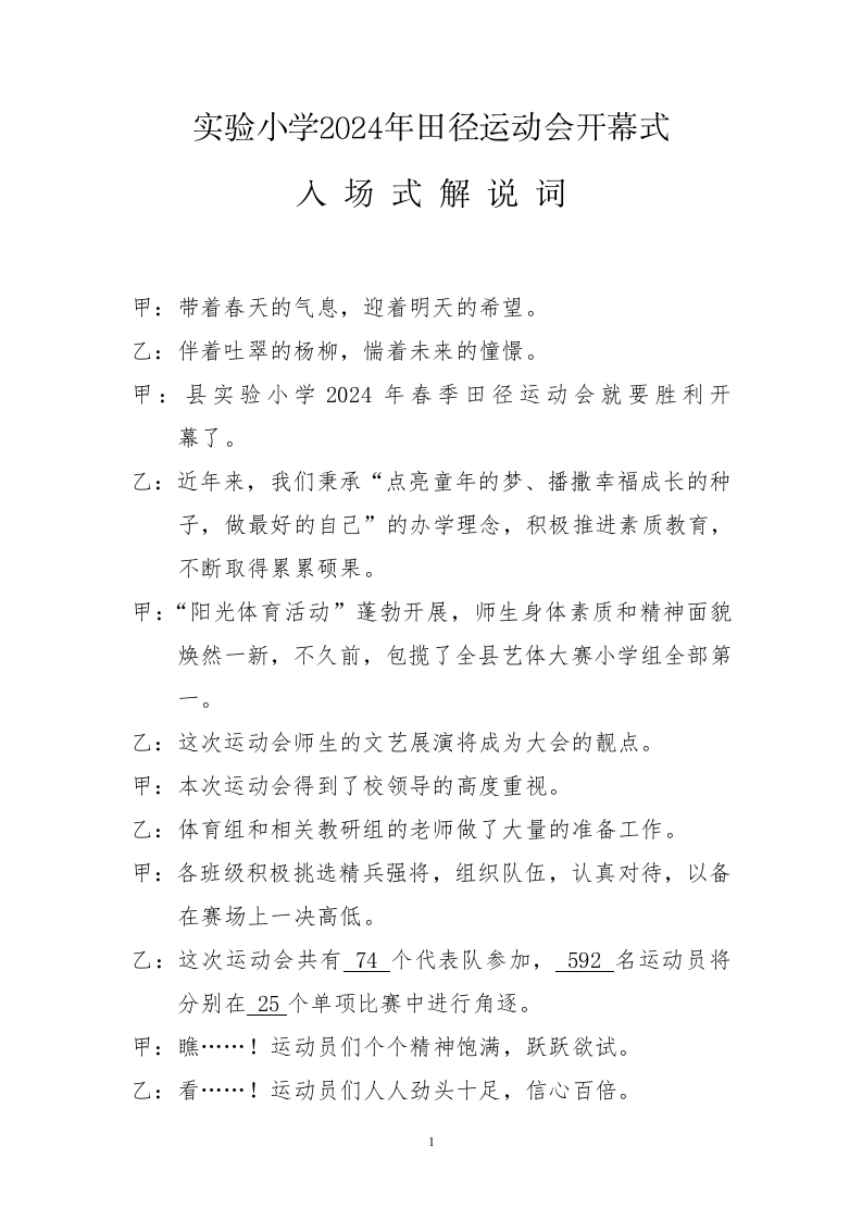 实验小学2024年田径运动会开幕式入场式解说词甲:带着春天的气息,迎着明天的希望。乙:伴着吐翠的杨柳,惴着未来的憧憬。甲:县实验小学2024年春季田径运动会就要胜利开幕了。乙:近年来,我们秉承“点亮童年的梦、播撒幸福成长的种子,做最好的自己”的办学理念,积极推进素质教育,不断取得累累硕果。甲:“阳光体育活动”蓬勃开展,师生身体素质和精神面貌焕然一新,不久前,包揽了全县艺体大赛小学组全部第乙:这次运动会师生的文艺展演将成为大会的靓点。甲:本次运动会得到了校领导的高度重视。乙:体育组和相关教研组的老师做了大量的准备工作。甲:各班级积极挑选精兵强将,组织队伍,认真对待,以备在赛场上一决高低。乙:这次运动会共有74个代表队参加,592名运动员将分别在25个单项比赛中进行角逐。甲:瞧…!运动员们个个精神饱满,跃跃欲试。乙:看…!运动员们人人劲头十足,信心百倍。1