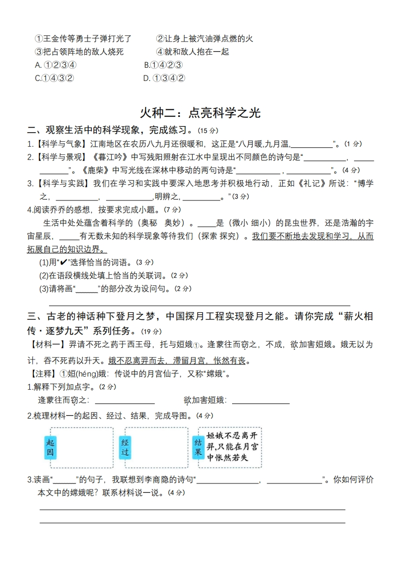 2025学年四年级上册语文情境主题试卷语文期中试卷时间:0分钟满分:100分奥运火种,燃起激情与梦想。生活中,我们也要做自己的火炬手,点燃梦的种子,照亮前行之路。火种一:植根红色热土一、2025年是中国人民志愿军抗美援朝出国作战75周年,请你阅读材料,完成练习。(18分)鸭绿江断桥,是抗美援朝战争的重要见证。站在dian()上,望着kuan kuo()的江面,shashi(),江水滚滚,响彻云霄,心中顿生zhen han(),思绪仿佛被牵回ceng jing()的岁月,qiang pàop()之下,是一幕幕cnIiè()又英勇的画面。抗美援朝纪念馆里的人们或低声细语或窃窃私语,彼此倾诉着崇敬之情。走进志愿军公园,此时这里锣鼓喧天,欢呼雀跃,仿佛在重现当年志愿军凯旋的场景。中国人民志愿军历经曲折与磨难,宁死不降,用单薄的身躯chēgq()一片天地。在新时代,要秉持先辈精神,延续他们的意志,为国家的繁荣不懈奋斗。1.看拼音写词语,将材料补充完整。(8分)2.下列加点字读音相同的一项是(2分)A欢呼雀跃家雀儿B.曲折异曲同工C.宁死不降降生D.单薄厚此薄彼3.下列加点字与材料中顿生"的“顿"意思相同的一项是(2分)()愛A顿首B.安顿C茅塞顿开D.抑扬顿挫阳4.上述材料中有一句话有语病,请你修改正确。(2分)5.读画线词,下列画面想象不恰当的一项是(2分)()】A响彻云霄:鸭绿江的江水向前迅速奔涌,与礁石相撞之时水花四溅,像是奏了一曲激昂的音乐。B低声细语:人们在抗美援朝纪念馆内,怀着崇敬与庄重的心情,轻声交流着对志愿军英雄事毁迹的感悟。C.窃窃私语:抗美援朝纪念馆内,小杨正在妹妹的耳边,小声地说着志愿军烈士的故事。D锣鼓喧天:人们在志愿军公园用充满激情的方式重现当年欢迎志愿军凯旋的热闹画面。6琪琪找到了下面的补充资料,将句子依次填入横线上,最恰当的一项是(2分)()中华人民共和国成立之初,中国人民志愿军雄赳赳气昂昂跨过鸭绿江,近20万英雄献出了宝贵的生命。在松骨峰战斗中,