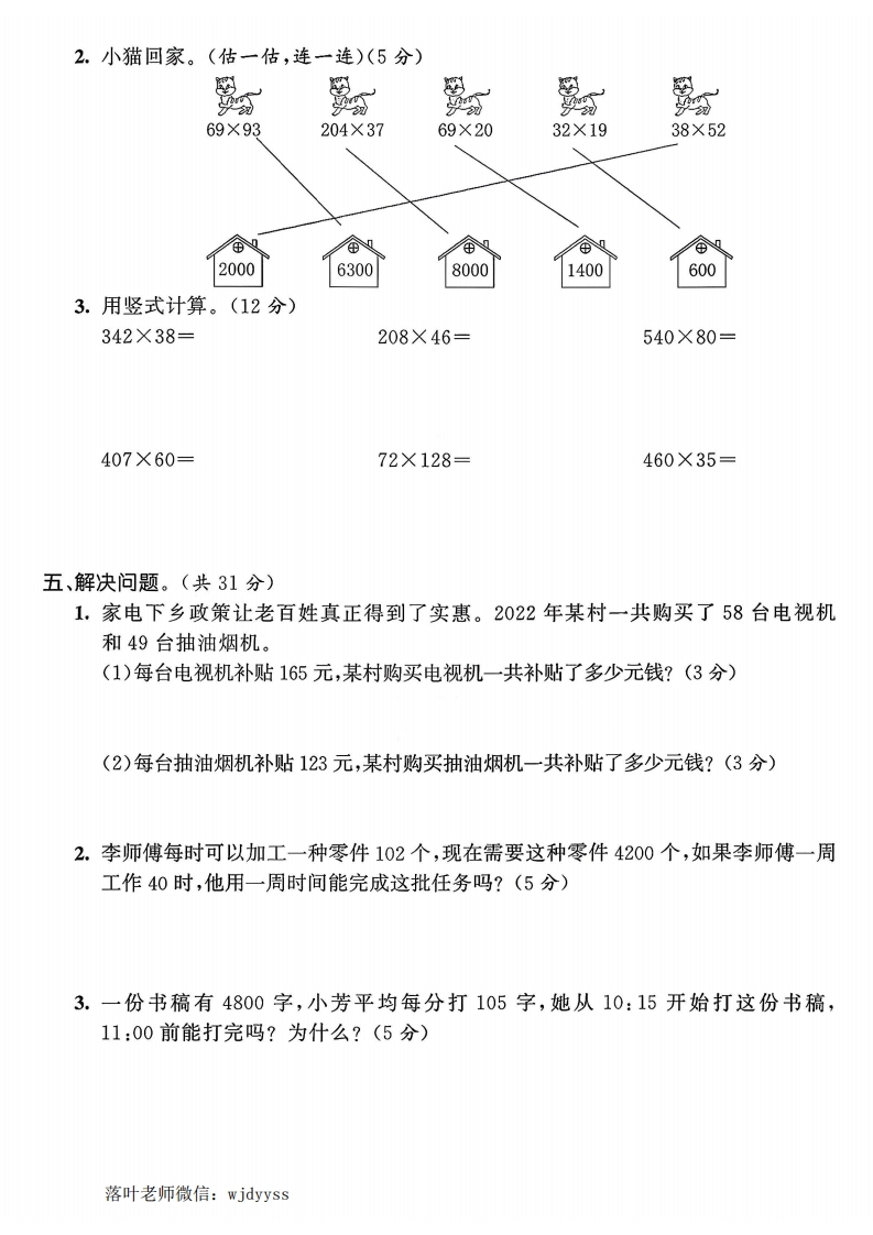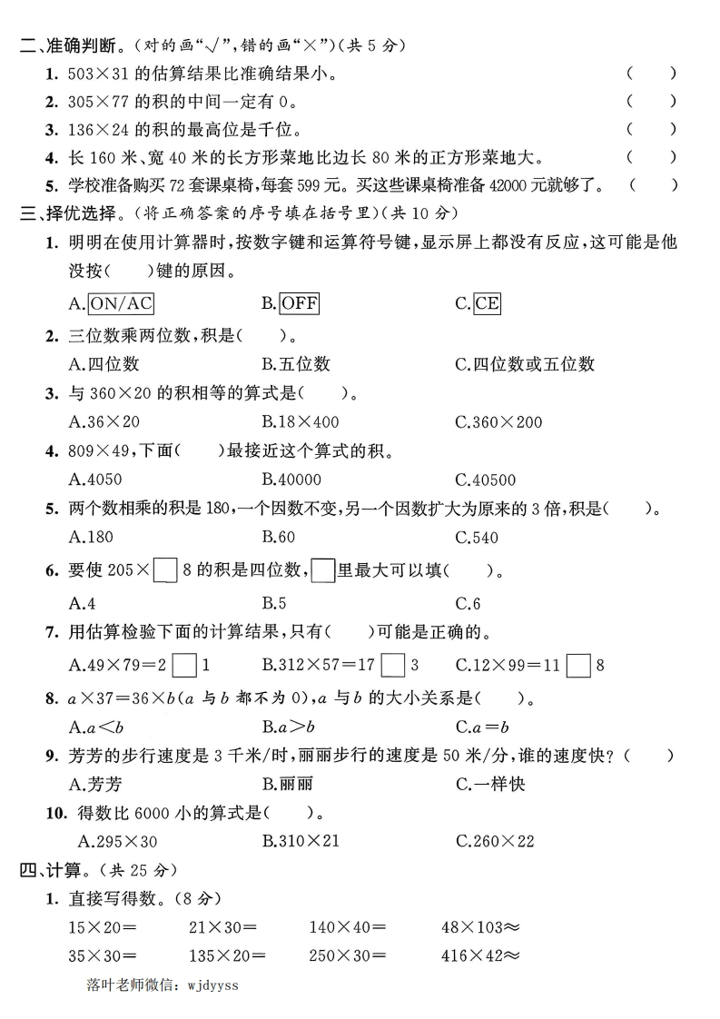 2025北师版四年级上册数学综合提优测试卷第三单元综合提优卷题号四五六总分得分时间:70分钟满分:(100+10)分一、填空题。(每空1分,共29分)1.计算230×40时,可以先算()乘()的积,再在积的末尾添上()个0。2.49×28的积是()位数,积大约是()3.160×50的积的末尾有()个0,125×80的积的末尾有()个0。密4.最小的三位数与最大的两位数的乘积是(5.在(○里填上“>”“<”或“=”。120×35○420408×11(○229×2225×8(○5×3022×15○22×3×56.某小区有15幢楼,平均每幢楼住144户,根据下面的竖式在右边的括号里填上合封适的数。144×15720>()幢楼住()户。144()幢楼住()户。线2160()幢楼住()户。7.要使09X32的积是四位数,里最大填()。8.新学期,王老师为学校篮球队购买运动服,每套运动服153元,王老师准备了6000元,这些钱()购买39套运动服。(填“能”或“不能”)9.一个乘数是37,另一乘数比它大50,这两个数的乘积是(10.乐乐1分能打118个字,他半小时大约能打()个字。11.明明做一道乘法计算题时,把其中一个乘数27误写成21,结果得到的积比正确的积少726,正确的积是()。12.找规律把算式写完整。(1)7×9=63(2)(10-1)÷9=177×99=7623(200一2)÷9=22777×999=776223(3000-3)÷9=3337777×9999=((40000一4)÷9=(77777×99999=((500000一5)÷9=(777777×999999=((6000000-6)÷9=(落叶老师微信:wjdyyss