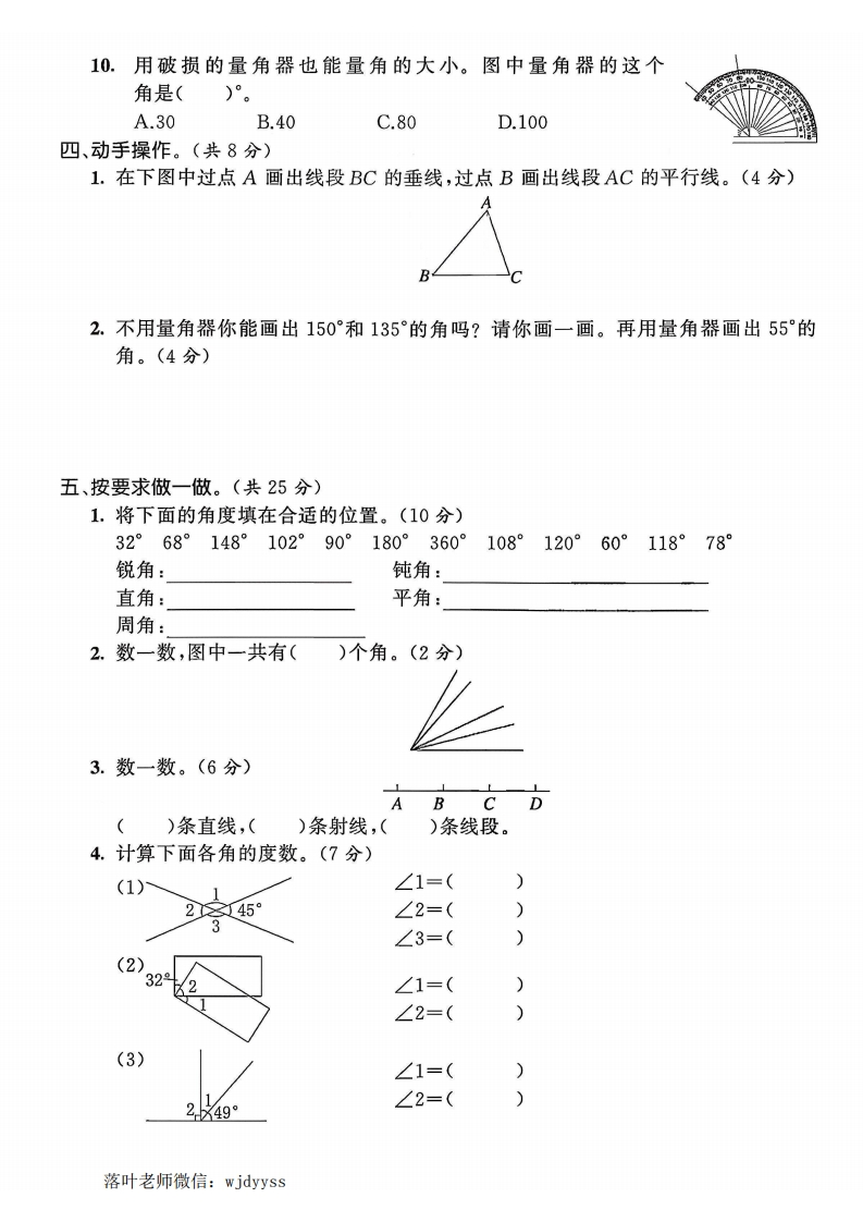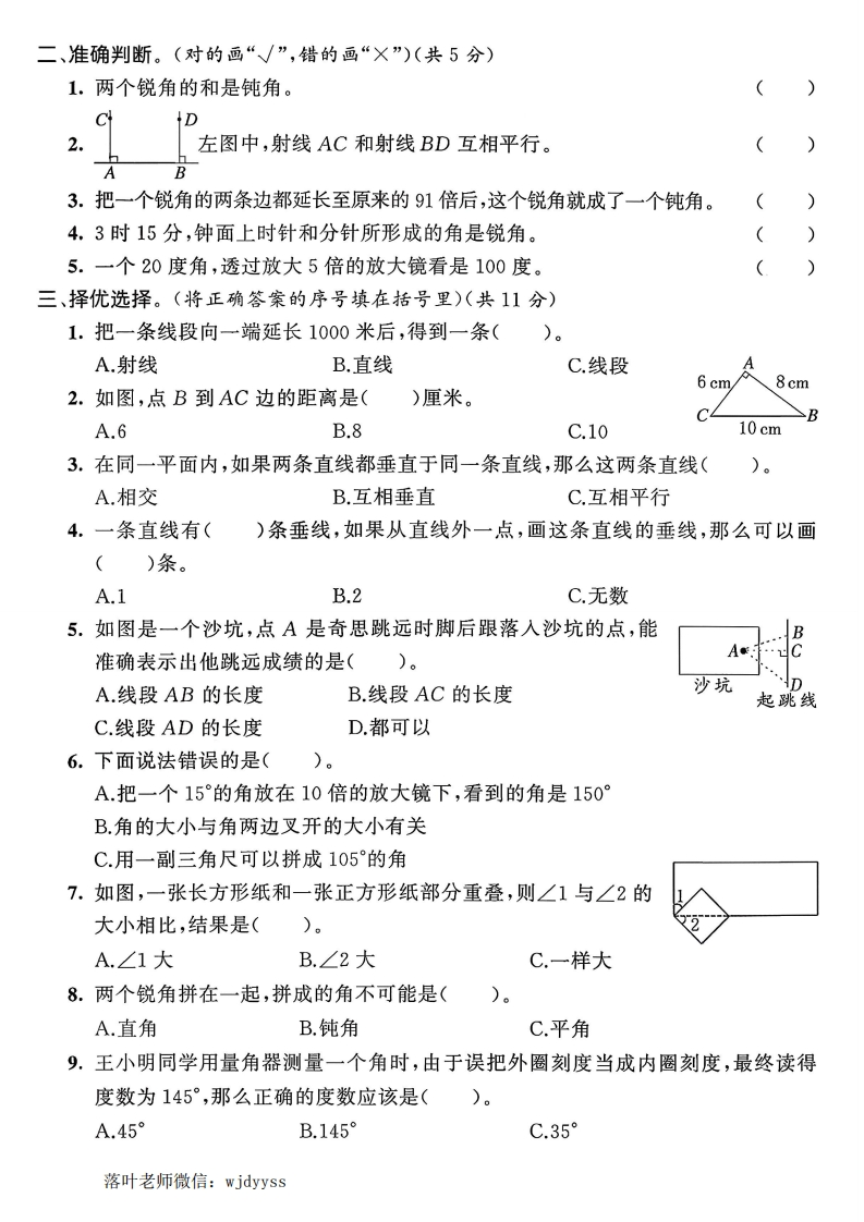 2025北师版四年级上册数学综合提优测试卷第二单元综合提优卷(时间:60分钟满分:100分)题号三四五六七总分得分一、填空题。(每空1分,共33分)1.过平面内任意一点可以画()条直线,过平面内任意两点可以画()条直线。从一点出发能画()条射线。2.在括号里填每组直线的位置关系。密3.图ABC中有()条线段,()条直线,()条射线。封4.1个周角=()个平角=()个直角=()°。5.有以下字母:A,F,H,L,N,Z。(1)只有互相垂直的线段的字母是(圍(2)既有互相垂直又有互相平行的线段的字母是()。6.长方形中相邻的两边互相(),相对的两边互相()。7.时钟显示3时的时候,分针和时针成()角,时钟显示()时的时候,分针和时针成平角。8.右图中,两块三角尺拼成的∠1是()角,等于()°,拼成的∠2等于()°。9.在75°,91°,89°,178°,180°,100°,90°,30°,105°,360°中,锐角有(91钝角有(),180°是()角。10.从池塘有三条小路通往公路,它们的长度分别是248米、312米和283米,其中有一条小路与公路是垂直的,那么这条小路的长度是()米。11.图中共有()个锐角、()个直角,()个钝角。345第11题图第12题图12.如图,已知∠1=28°,那么∠2=()°,∠3=()°,∠4=()°,∠5=()。落叶老师微信:wjdyyss