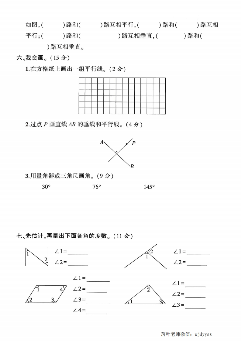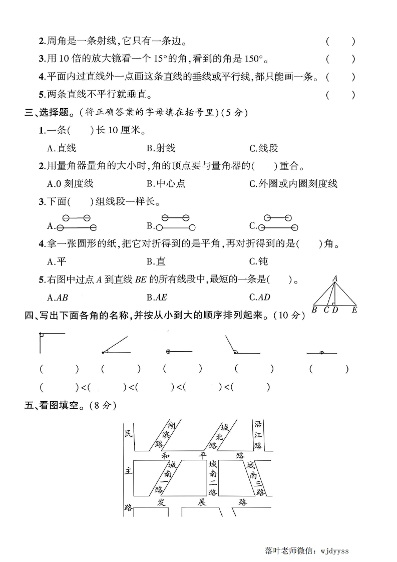 2025北师大版四年级数学上册单元测试卷第二单元测试卷器检测时间:90分钟满分:100分+10分题序三四五六七八九附加题总分得分弥一、填空题。(每空1分,共20分)1.图①是(),图②是(),图③是()o毁封D③线2.把()的一端无限延长,就得到一条射线,射线有()个端点。3过一点可以画()条直线,过两点可以画()条直线。内4读出下面的度数。蠻不要5.从奇思家到妙想家有4条路,走()号路最近,答理由是()奇思家①②妙想家袋题6.度量角的大小,可以用()来测量,它把半圆平均分成()份。7.一个平角相当于()个直角,一个周角相当于()个平角,相当于()个直角。8.用一副三角尺拼一个105°的角,需要()和()两个度数的角。9.两条直线相交,组成的四个角中,有一个是锐角,那么其他三个角中,两个必是()角,另一个必是()角。唾二、判断题。(对的画“V”,错的画“X”)(5分)》e1.3时整,钟面上的时针与分针所形成的较小角是直角。()落叶老师微信:wjdyyss