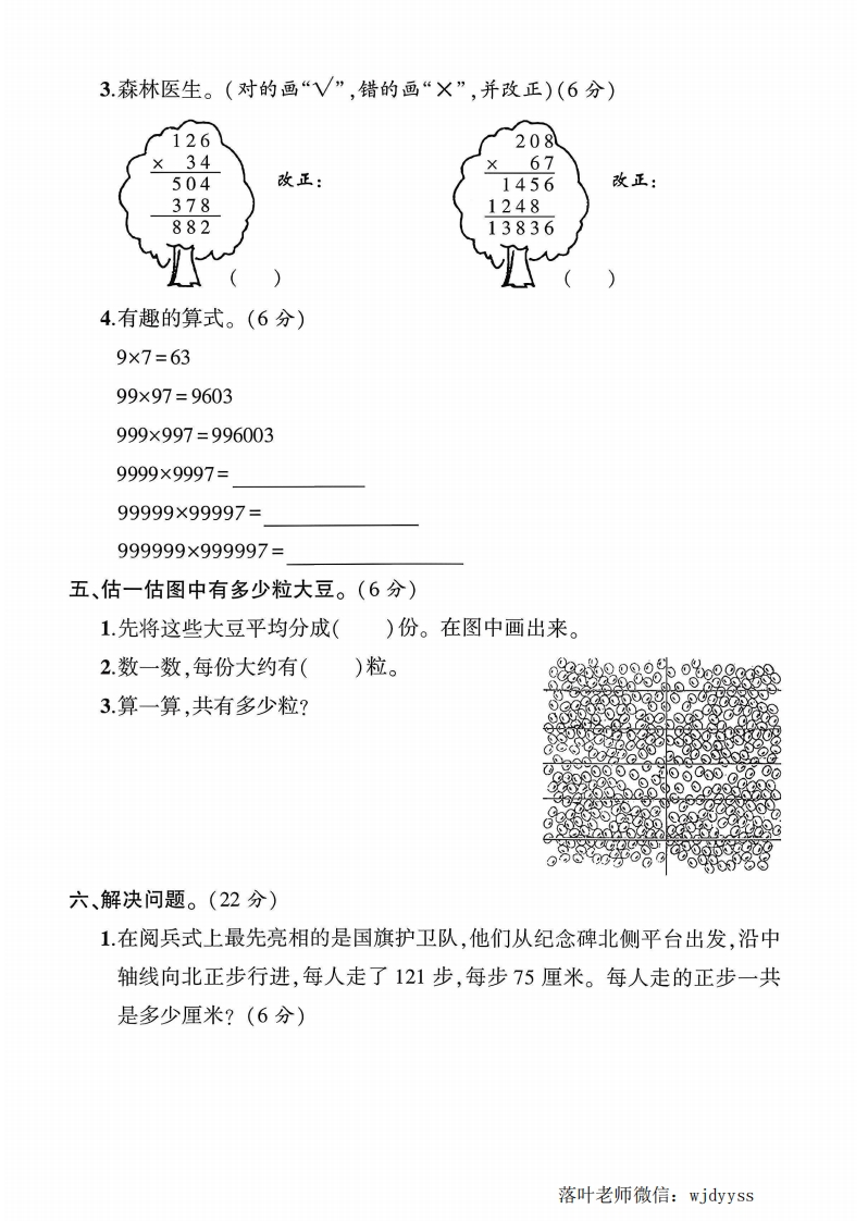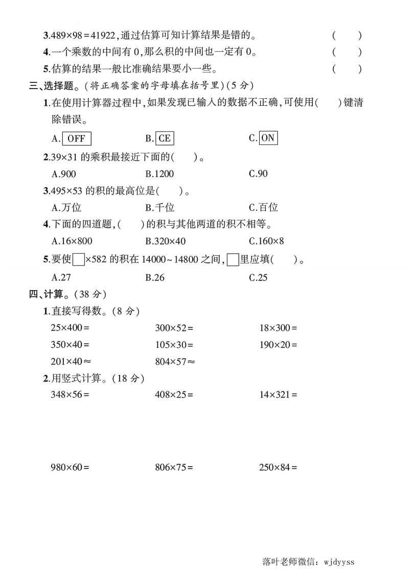 2025北师大版四年级数学上册单元测试卷第三单元测试卷检测时间:90分钟满分:100分+10分题序二三四五六附加题总分得分弥一、填空题。(每空1分,共24分)1.332×23的积是()位数;325×80的积是()位数。封2.148个25的和是();360的18倍是()3.在估算97×41时,可以把97看作(),把41看作(),所以97×41线≈()4.928×34的积的末位数字是(),125×78的积的末位数字是(内5.750×40的积的末尾有()个零,它的积是一个()位数。6.工人加工零件,每天加工126个,25天共加工多少个?根据竖式填空。童不1265天加工了(×25)个;63020天加工了()个要252315025天加工了()个。7.括号里最大能填几?答40×()<281600×()<4900)×700<3600题8.不计算,在(○里填上“>”“<”或“=”。203×19(○230×19403×81403×7934×456456×30782×63(○782×70120×80240×4065×300()650×309.学校准备给数学组的老师每人配一个现代化办公桌,全校共有19名数学老师,每张办公桌998元,大约共需要准备()元因二、判断题。(对的画“V”,错的画“X”)(5分)啦1.三位数乘两位数,积一定是五位数。(e2.204×32的积比6000大。落叶老师微信:wjdyyss