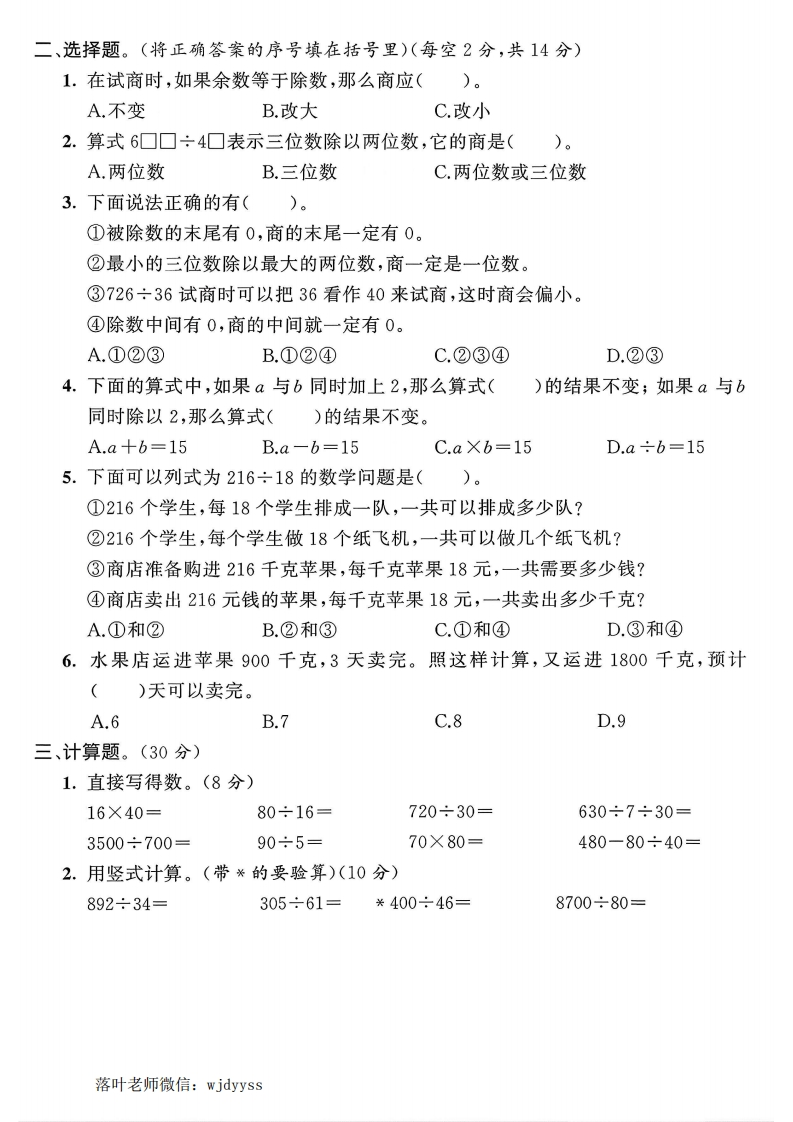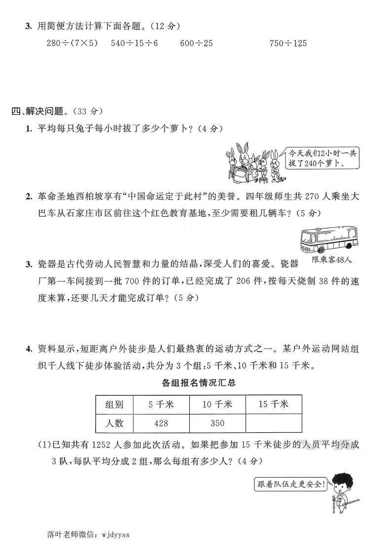 2025冀教版四年级上册数学综合提优测试卷第二单元综合提优卷题号四五总分得分时间:90分钟满分:(100+10)分一、填空题。(每空1分,共23分)1.☐57÷38,要使商是一位数,口里可以填();543÷5□,要使商是两位数,口里最大填();4☐3÷47,当☐里填()时,商的末尾有0。密2.△÷☐=12…9,除数最小是(),此时的被除数是()。3.括号里最大能填几?30×()<28340×()<51240×()<27550×()<31230×()<18450×()<724封4.一个数除以25,商是12,余数最大是(),此时被除数至少再加上()就没有余数了。5.根据左边的算式,直接写出右边算式的结果。屋(1)888÷24=37444÷12=()线(2)240÷16=15480÷32=((3)43÷8=5…34300÷800=()…(6.某种商品的价格降为原来的一半后,原来购买30件该商品的钱,现在可以购买()件。7.☐÷28=40…△,☐最大是();0÷☆=17…19,○最小是()。8.周末乐乐全家开车去植物园,全程168千米,汽车每小时行驶56千米,10:00到达。已知途中加油用了15分钟,乐乐全家是()出发的。9.计算3☐1÷37时,把37看成40来试商,商8但是商小了,应该商9,口里可以填()。10.小红在计算一道除法算式时,把被除数567误写成521,导致商比原来少2,但余数不变,则这道算式正确的结果是()。落叶老师微信:wjdyyss