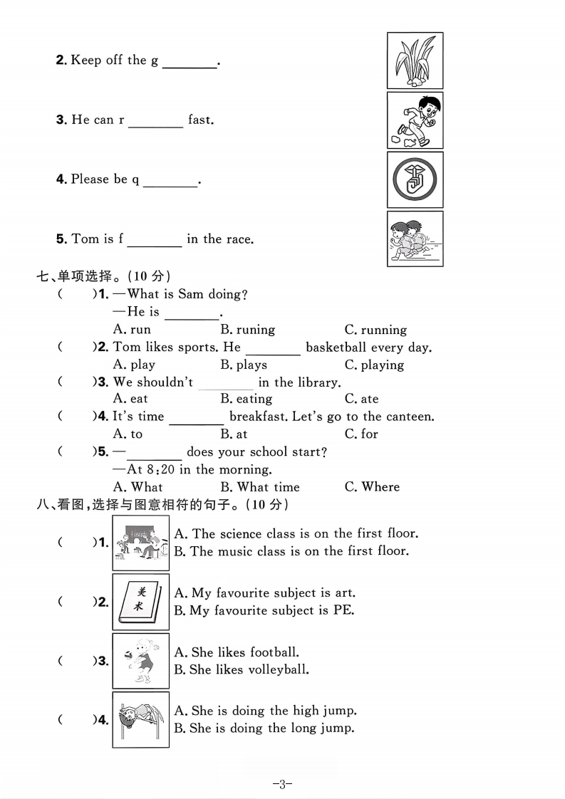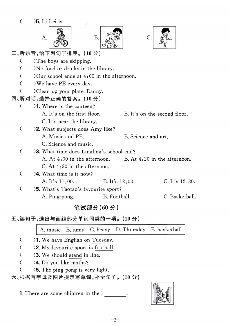 2025-2026学年冀教版四年级上册英语期中测评卷期中综合素养测评卷时间:40分钟满分:100分题号二三四五六七八九+总分等级得分孤听力部分(40分)一、听录音,选出你听到句子中所包含的单词。(10分)密()1.A.jumpB.walkC.run()2.A.afraidB.quietC.stand()3.A.sportsB.subjectsC.days细()4.A.EnglishB.mathsC.Chinese封()5.A.playerB.footballC.ping-pong二、听录音,根据所听内容选择正确的答案。(10分)】)1.We havein the afternoon.英语B.线警)2.I like theA.B)3.Don't紧A.B)4.We shouldB.新C.少片者里ob