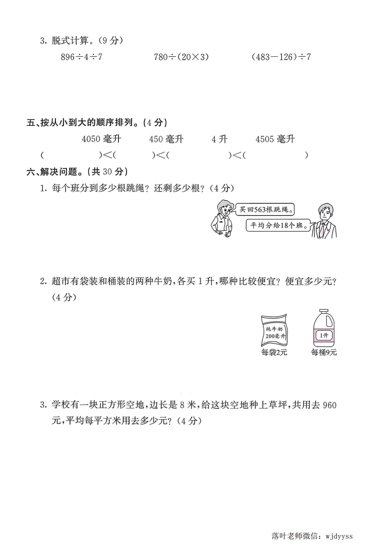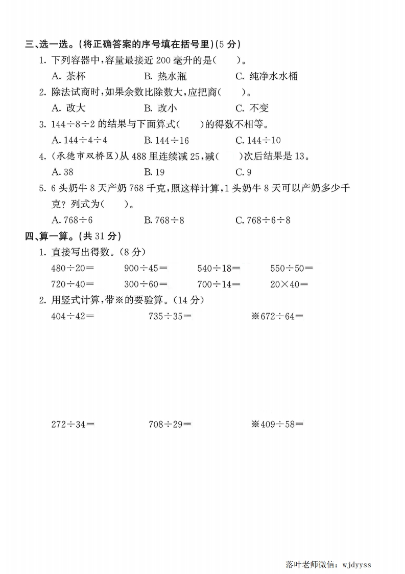 2025冀教版四年级数学上册单元测试卷第一、二单元综合测试卷(时间:90分钟分数:100分)一、填一填。(每空1分,共25分】1.在括号里填上合适的单位。(1)一瓶农夫山泉水有550()。(2)一水壶水有2()。(3)一个洗菜池大约可以装水30((4)一勺汤有10(2.在括号里填上适当的数。2升=()毫升3000毫升=()升9升=()毫升3.一桶2升的可乐倒入容量为250毫升的杯子里,可以倒()杯。倒入容量为500毫升的杯子里,可以倒()杯。4.76÷57,要使商是一位数,里最大填();要使商是两位数,☐里最小填()。5.包装一个礼品盒需要25厘米长的丝带,一根830厘米长的丝带能包装()个这样的礼品盒。6.△÷36=10…☆,余数最大是(),这时被除数是()7.根据880÷44=20,直接写出下面各题的商。440÷22=()220÷11=()1760÷88=(8.括号里最大能填几?图40×()<24670×()<64560×()<50835×()<21624×()<160()×78<6509.花店里有645朵花,做一个花篮要用25朵花,这些花最多能做(龄个花篮,再添上()朵花又可以做一个花篮。二、明辨是非。(对的打“/”,错的打“×”)(5分)】1.在计算360÷48时,可以把48看作50来试商。()2.因为8÷3=2…2,所以80÷30=2…2。(国3.三位数除以两位数,商可能是一位数,也有可能是两位数。()4.一桶3升的饮料倒入容积为100毫升的杯子里,能倒3杯。)5.被除数的末尾有0,商的末尾不一定有0。()落叶老师微信:wjdyyss