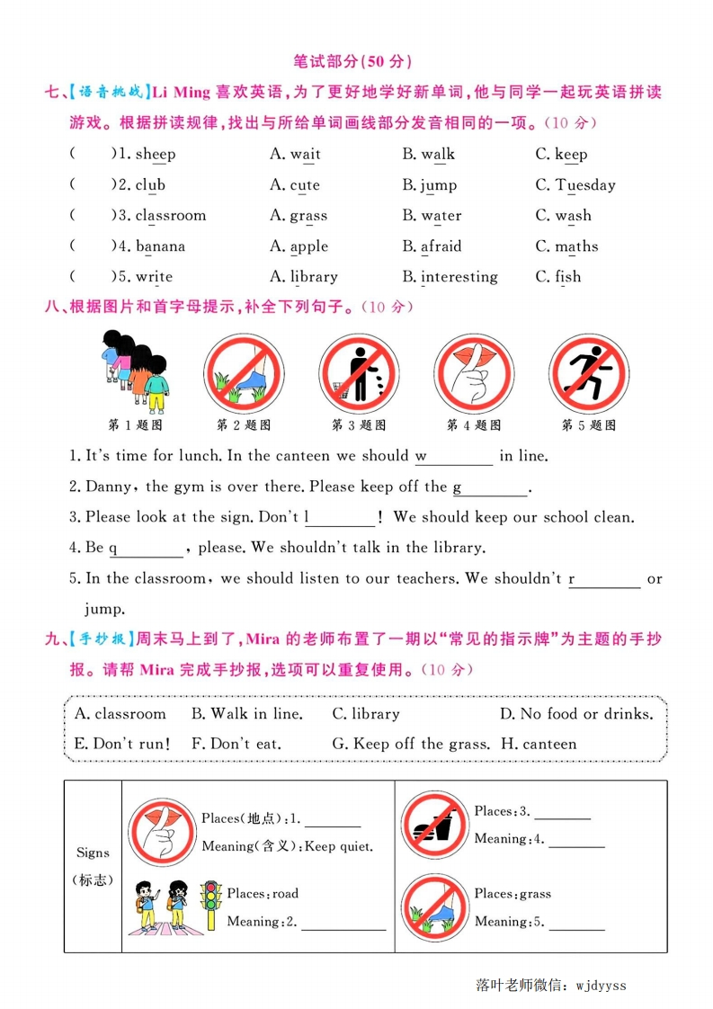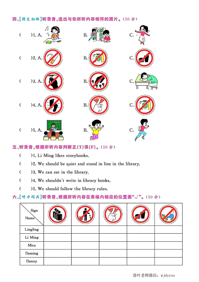 2025冀教版四年级英语上册单元测试卷Unit2综合素养提优卷时间:60分钟书写等级:质量等级:听力部分(50分)▣王[听力帝]一、【语音桃战Li Ming正在和同学们认识新单词。听录音,根据拼读规律帮Li Ming选出正确的选项。(5分)弥)1.A.keepB.deepC.weep)2.A.funB.sunC.gun()3.A.jumpB.bumpC.dump)4.A.beatB.seatC.read)5.A.talkB.walkC.chalk二、【精桃细选】遵守校园规则,从我做起。听录音,用数字给下列图片排序。(5分)三、听录音,选出你听到的句子。(10分))1.A.We shouldn't run in the library.B.We shouldn't eat in the library.)2.A.Mira hides behind her book.She is afraid.B.Mira hides behind her bag.She isn't afraid.救()3.A.She feels better.She likes her new class.B.She doesn't like her new class.()4.A.We should go to bed on time.B.We should get to school on time.()5.A.We shouldn't waste food.B.Don't waste food.落叶老师微信:wjdyyss