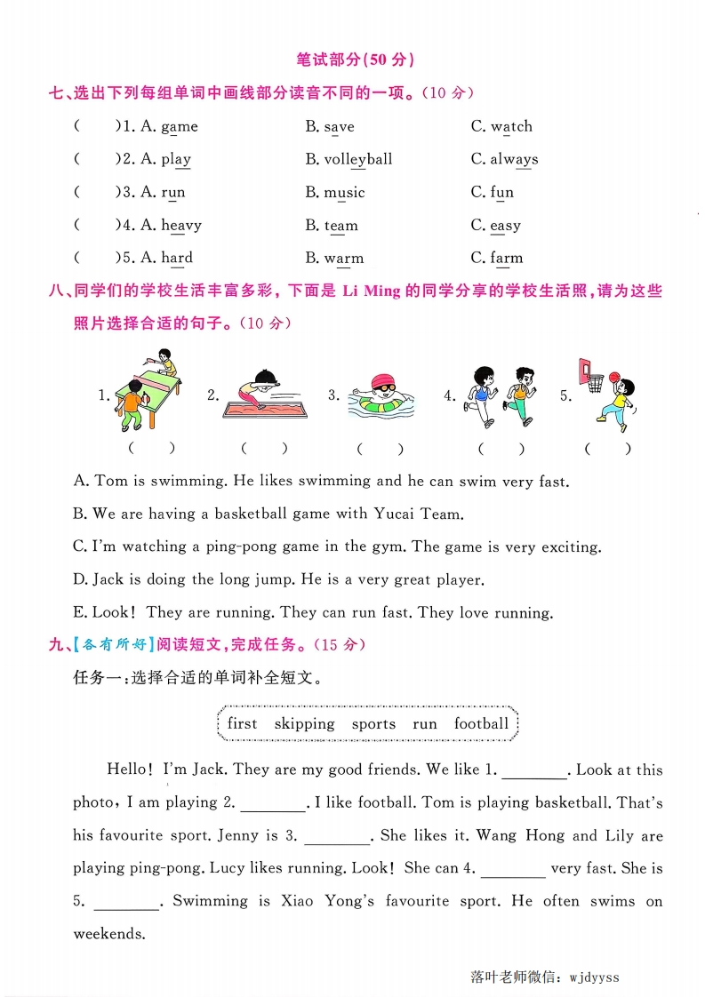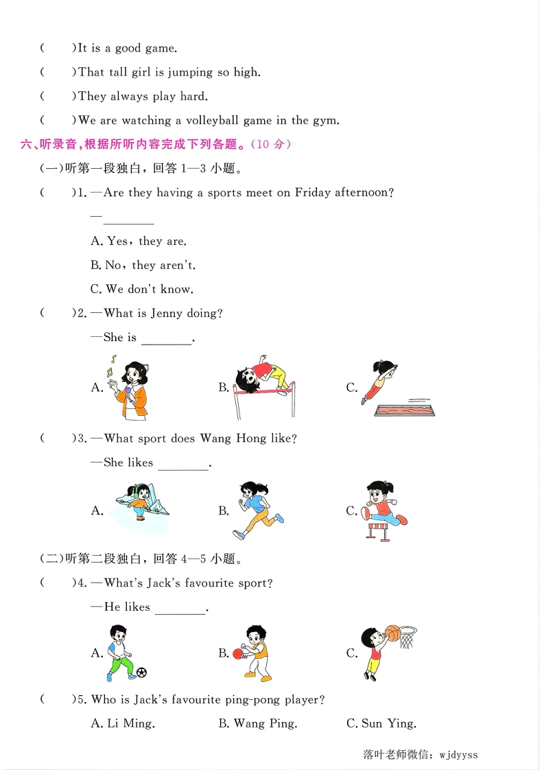 2025冀教版四年级英语上册单元测试卷Unit3综合素养提优卷时间:60分钟书写等级:质量等级:▣空5听力部分(50分】▣3[听力音频】一、【先后有序】听录音,根据所听内容用数字给下列图片排序。(5分)ackTom二、【辨真识假】听录音,判断下列图片与你所听内容是(T)否(F)相符。(5分)量三、听录音,选出你所听问句的正确答语。(10分)()1.A.Yes,it is.B.Yes,I do.C.Yes,he does.)2.A.In the gym.B.A volleyball game.C.A volleyball.()3.A.Running.B.On TV.C.She is first.()4.A.Come on!B.Yes,she is.C.It is easy.)5.A.Yes,I am.B.I'm a good player.C.Basketball四、【一一对应】听录音,根据对话内容将人物与对应的图片连线。(10分)1.Li Ming2.Jenny3.Wang Hong4.John5.Dan毁五、听录音,根据所听内容的先后顺序,用数字给下列句子排序。(10分))The game is very exciting.落叶老师微信:wjdyyss