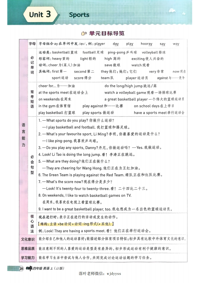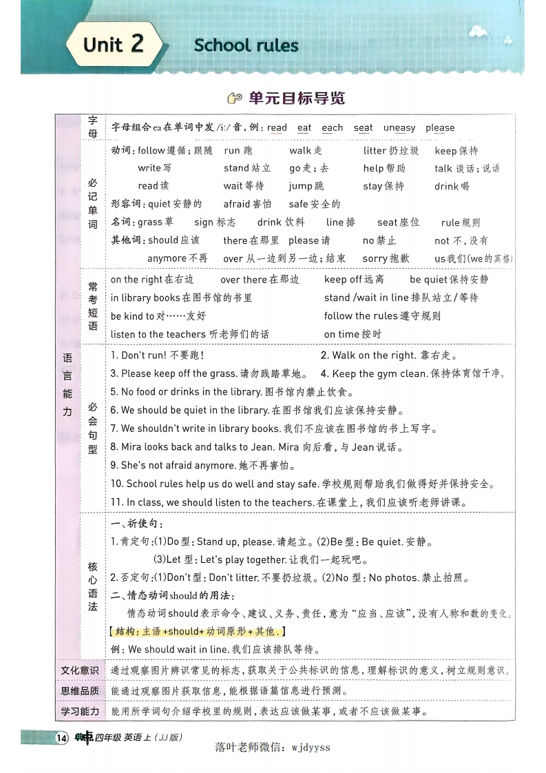 Unit 1School Life的单元目标导览母字母u在单词中发ju:/音,例:tunemusicTuesdaycomputer student场所类:library图书馆cla5 sroom教室playground操场canteen餐厅学科类:subject学科art美术maths数学Chinese语文必English英语science科学music音乐PE体有名词:computer电脑class课;班floor层Russia俄罗斯单test实验;测试afternoon下午today今天词动词:show指给某人看;显示start:开始end结束has有其他词:interesting有趣的beautiful美丽的to向,朝,往;到with和what什么your你的every每一个our我们的常play a tune弹奏一支曲子do tests做实验考tell an interesting story讲一个有趣的故率in Chinese class在语文课上语every day每天on the first/second floor在第-/第二层next to在…旁边语言1.Welcome to our school!欢迎来到我们的学校!能2.一Where is the canteen?餐厅在哪儿?力一Let me show you!让我指给你看!3.一What classes do we have on Monday?周一我们有什么课?必-We have Chinese,maths,PE and English in the morning.会句我们上午有语文、数学、体育和英语课。型4.一What subjects do you like?你喜欢什么科目?一like maths and science..我喜欢数学和科学。5.Wang Lele plays a tune in music class on Tuesday.王乐乐在周二的音乐课上弹奏一曲。6.一What time does your school start?你们学校几点开始上课?一At8:30 in the morning.早上八点半。介绍某人某天在某节课的活动:核心【结构:第三人称主语+动词的第三人称单数形式+其他,】Wang Lele's teacher tells an interesting story in Chinese class.法王乐乐的老师在语文课上讲了一个有趣的故事。了解、比较并用简单的单词、句子描述中外不同学校在课程设置、学习时间上的不同,能简文化意识单描述学生的学习活动和感受。思维品质能通过观察图片获取信息,能根据语篇信息进行推测。学习能力能用所学词句介绍学校课程和校园活动。Unit School life(1落叶老师微信:wjdyyss
