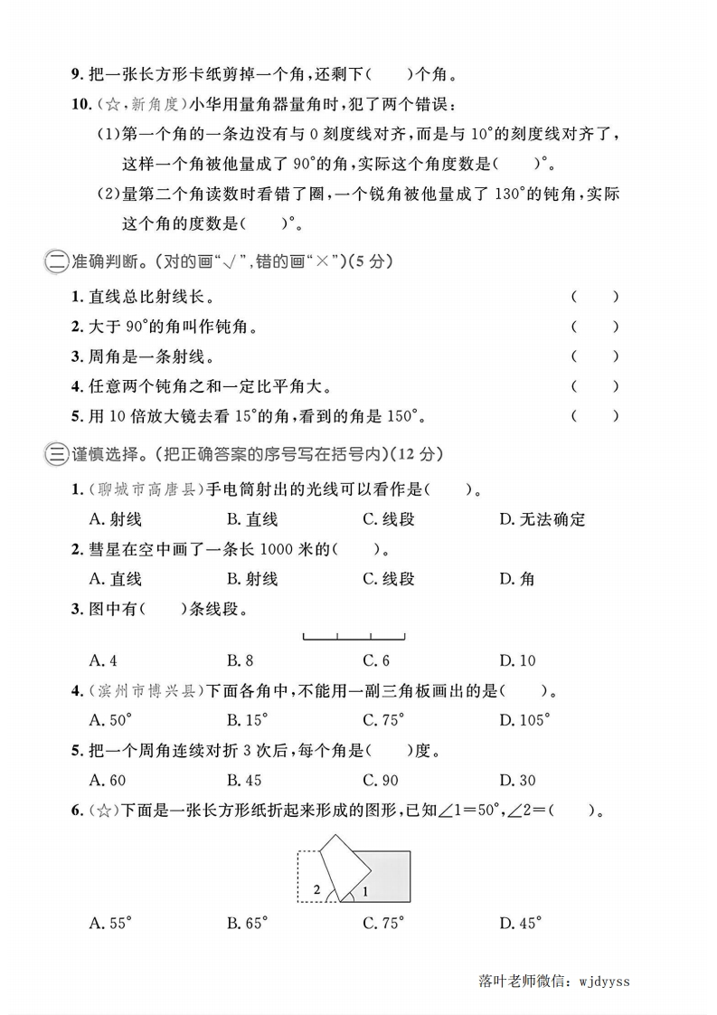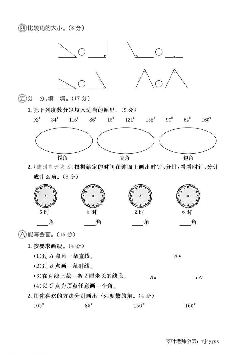 2025青岛63制四年级数学上册单元测试卷第二单元测试卷密⊙测试时间:60分钟⊙满分:100分+卷面:5分评价毁○仔细填空。(30分)1.(新情境)在数学课上,我们认识了线家族的三个兄弟:能测量长度的(可以向两端无限延长的()和只有1个端点的();三个兄弟告诉我们:做事要像()那样“有始有终,坚持到底”;学习要像()那样“有始无终,勇往直前”;想象要像()那样“无始无终,自由大胆”。2.角的计量单位是(),在量角器上把半圆平均分成180份,每份对应的角的度数记作()。3.角的两条边是两条();角的大小与()有关,与封()无关。4.如图,钟面上一大格是()°,一小格是()°,4:00时,时针和分针所形成的夹角的度数是()°。5.看图填角的度数。弥6.如果∠1和35°角正好组成一个直角,则∠1=()°;如果∠2和35°角正好组成一个平角,则∠2=()°。7.(青岛市平度市)钟面上3时整和()时整,时针和分针成直角;(爵时整,时针和分针成平角;12时15分,时针和分针成()角:9时30分,线时针和分针成()角。8.用一副三角尺拼成下面的角,请写出拼出的角的度数。公落叶老师微信:wjdyyss