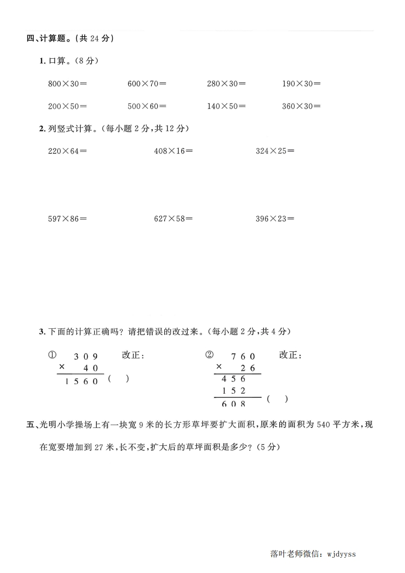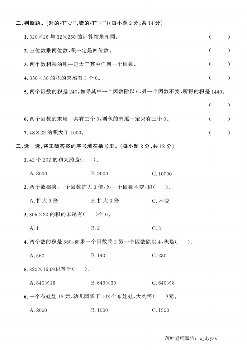 2025青岛63制四年级数学上册第三单元测试卷第三单元测试卷(检测时间:60分钟满分:100)器题序三四五六七八总分得分一、填一填。(每空1分,共25分)密1.计算256×98,先算(),积是(),然后算(),积是),最后把两个结果相加,得到256×98的积是()。毁封2.因数末尾有“0”的乘法,可以把()的数相乘,然后看因数末尾一共有(线),就在乘得的积的末尾添写(),这样可以使运算简便。3.两个因数分别是26和8,积是(),如果把一个因数扩大到原来的50倍,积是内黛」不4.190×90的积的末尾有()个0,550×40的积的末尾有()个0。5.从0,2,8,9,7这五个数字中任取三个数字组成一个最大的三位数是(),任取两要个数字组成一个最小的两位数是(),这两个数相乘的积是()。答6.最大的三位数是(),用它乘最大的两位数,积是()。7.王老师想买18个篮球,每个篮球的价格是59元,他大约需要带()元钱。靠题8.3个162是486,30个162可以看成是()个486。9.32×15=480,那么16×15=(),32×45=(10.在下面的(○填上“>”“<”或“=”。45×40○450×4230×32320×20336×20289×30520×35490×45径落叶老师微信:wjdyyss