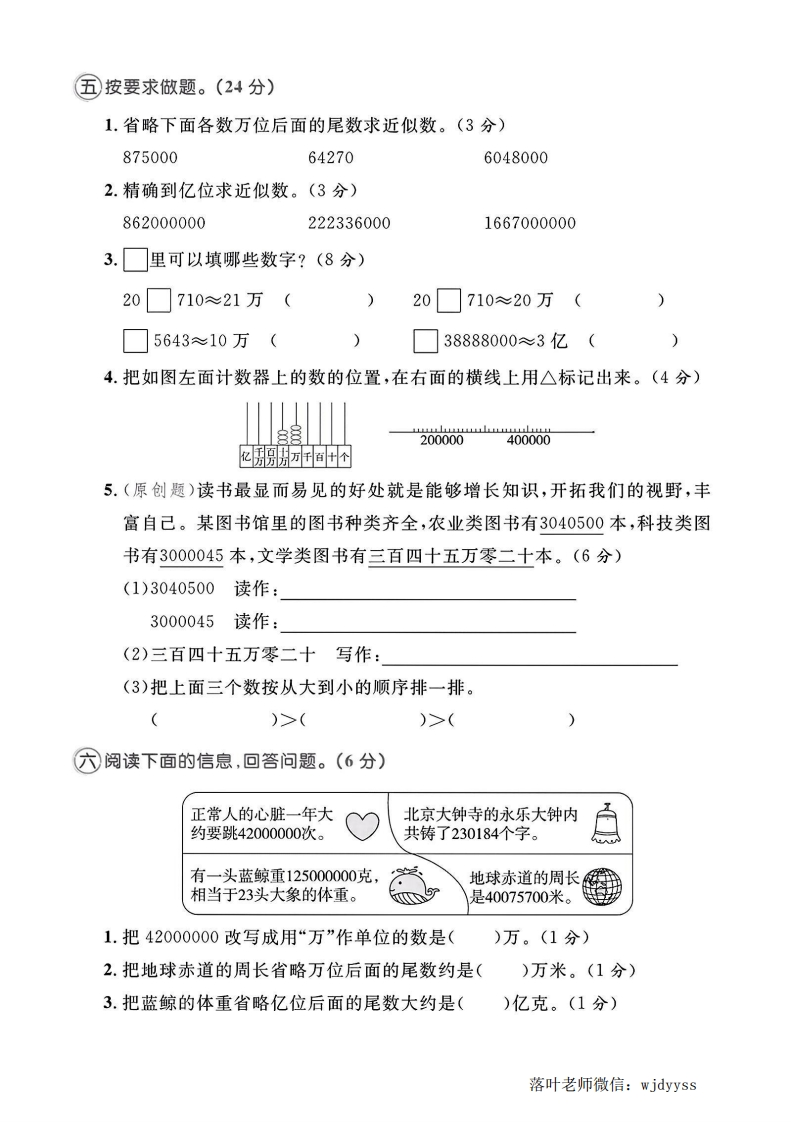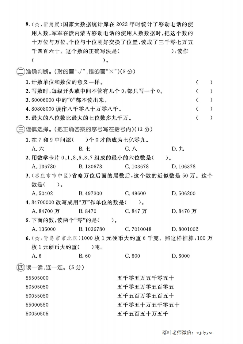 2025青岛63制四年级数学上册单元测试卷第一单元测试卷密⊙测试时间:60分钟⊙满分:100分十卷面:5分评价毁⊙仔细填空。(28分)1.个、十、百、千、万、十万…都是()。每相邻两个计数单位之间的进率都是()。这种计数方法叫作()。2.在54后面添上()个0,这个数就变成五十四万。3.9080600是一个()位数,其中“9”在()位上,表示9个();“8”在()位上,表示8个();“6”在()位上,表示6个()。4.(聊城市东阿县)2023年5月28日,国产大型客机C919圆满完成全球首次商业载客飞行,正式走向全球民航市场,一台C919大型客机售价为封99000000美元,横线上的数读作()美元,省略亿后面的尾数,约为()亿美元。5.在○里填上“>”“<”或“=”。器324678○3206782亿○19000000809万○809000025640000○2654000088万○1亿345亿○345000006.(新情境)“直播带货”已成为促进地区经济、文化发展的有效途径。2023年5月20日某直播间走进太原古县城。据了解,当日直播间内100多种山西特产的销售总额突破75000000元。横线上的数读作(,这个数是由()个千万和5个()组成的,改写成用“万”作单位的数是爵(线)万。7.(德州市夏津县)省略万位后面的尾数:79口903≈80万,口里最小可以填();205口999≈205万,口里最大可以填()。8.(改编题)背国小学为每一位学生编了学籍号,设定末尾用“1”表示男生,用“2”表示女生,如1602291表示2016年人学的2班29号男生,那么2023年入学的4班5号女生的学号应为()。落叶老师微信:wjdyyss