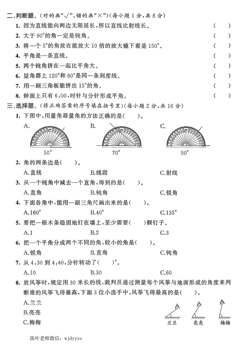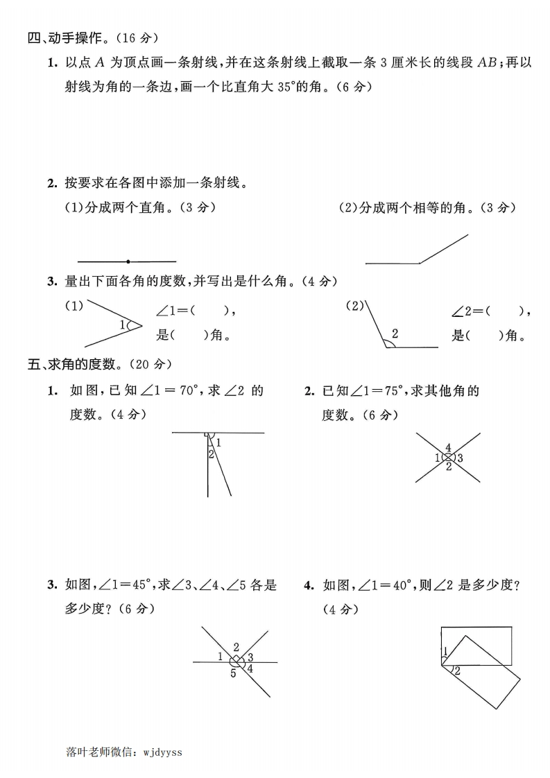 2025人教版四年级上册数学综合提优测试卷第三单元综合提优卷题号四五六七总分得分时间:70分钟满分:(100+10)分一、填空题。(每空1分,共25分)1.下面的图形中,哪些是线段?哪些是直线?哪些是射线?(填序号)①②③④⑤(6线段有(),直线有(),射线有(2.下面各钟面上的时针和分针分别组成的是什么角?多少度?写在括号里。封)角)角)角)角)°)°)()3.列队练习时,原地向右转,转过了一个()的角;原地向后转,转过了一个()的角。4.下面用一副三角尺拼出的角各是多少度?∠1=/2∠3=∠4=5.把半圆分成180等份,每一份所对应的角是()度的角,周角包含了()个这样的角。6.在75°,91°,89°,178°,180°,100°,90°,30°,105°,360°中,锐角有(钝角有()。7.一个角的两条边在一条直线上,这个角是()角,它等于()个直角。8.如果∠1和55°的角正好组成一个直角,那么∠1是()°;如果∠2和55°的角正好组成一个平角,那么∠2是()°。落叶老师微信:wjdyyss