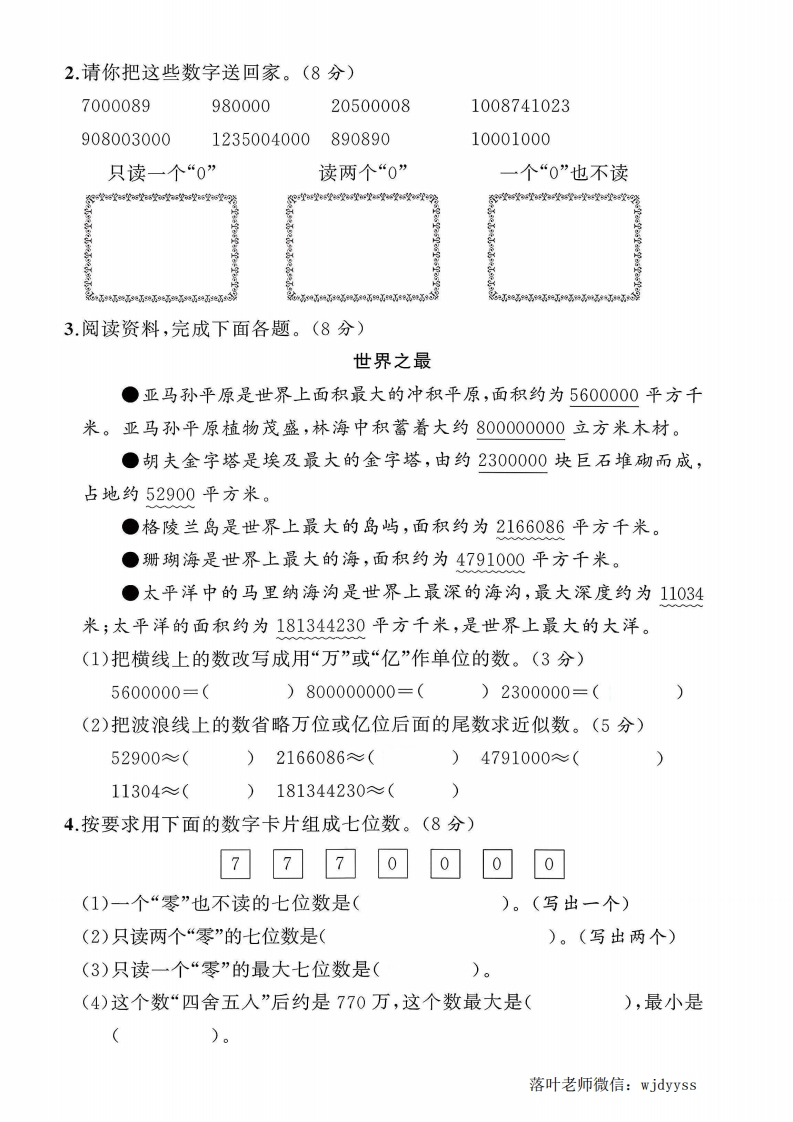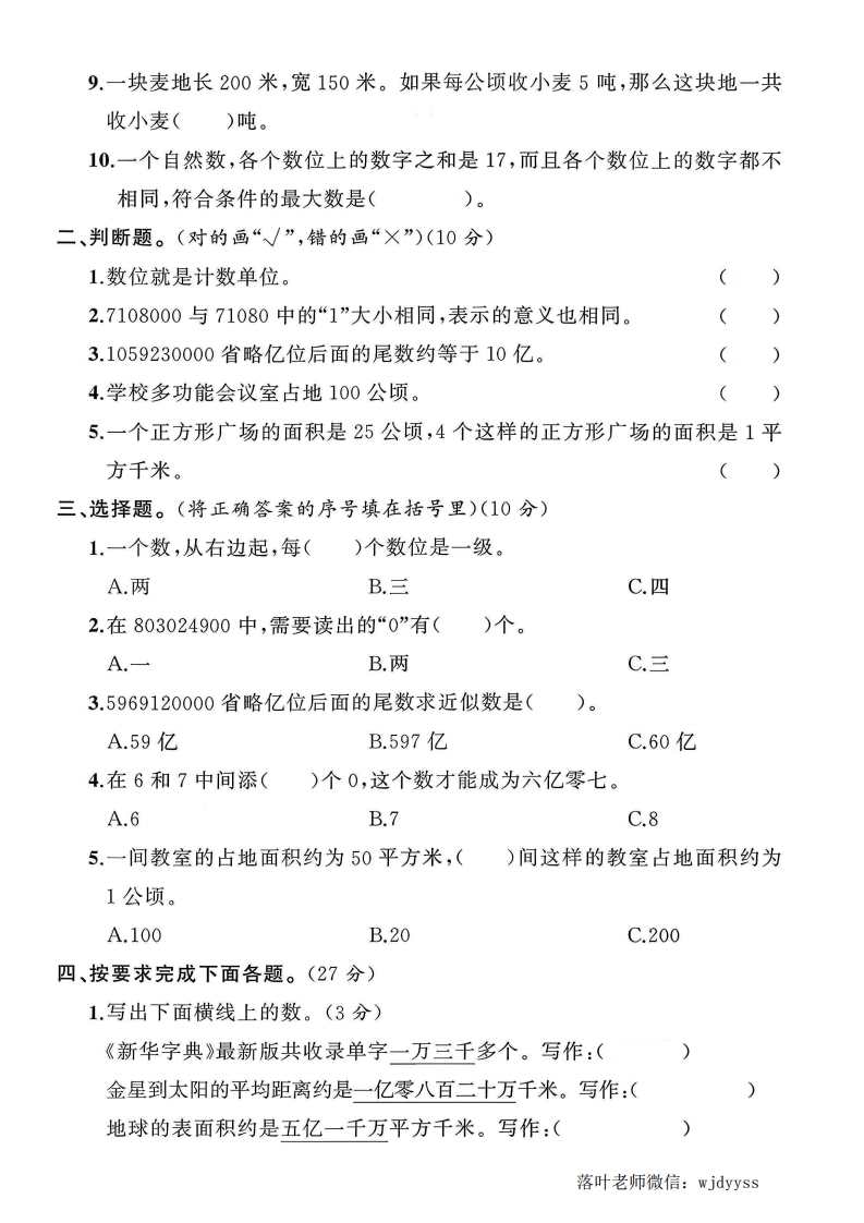 2025人教版四年级数学上册第一次月考卷(检测范围:第一、二单元)时间:90分钟满分:100分+10分题序三四五附加题总分得分一、填空题。(每空1分,共29分):弥1.全球最大且最灵敏的射电望远镜一“中国天眼”占地面积为260000平方米,260000读作()。“中国天眼”能够接收到一百三十七亿封四千万光年以外的电磁信号,一百三十七亿四千万写作(),省略亿位后面的尾数约是()亿。线2.大雁塔北广场是陕西省的文化景点和形象景点。大雁塔北广场的建筑面积约110000平方米,合()公顷。内3.六十万零四十八写作(),它的最高位上的计数单位是(数字“4”在()位上,表示()。不4.一个七位数,百万位和万位上都是7,百位和个位上都是3,其余数位上都是0。这个数是(),读作()。要5在○里填上“>”“<”或“=”。78200000○783万660000平方米○66平方千米350万○35010002公顷○2000平方米95000000○1亿6000公顷()60平方千米题6.4公顷=()平方米9平方分米=()平方厘米1300公顷=()平方千米15平方米=()平方分米7.一个七位数,“四舍五人”到万位后得到的近似数是621万。这个数最大:是(),最小是(:)☒:8.用计算器计算前三道算式,再根据规律写出其他算式的得数。1122÷34=()111222÷334=()11112222÷3334=(:1111122222÷33334=()111111222222÷333334=(落叶老师微信:wjdyyss