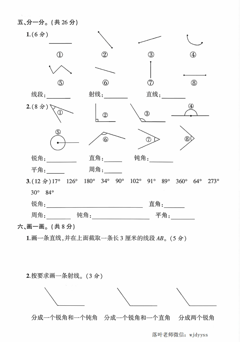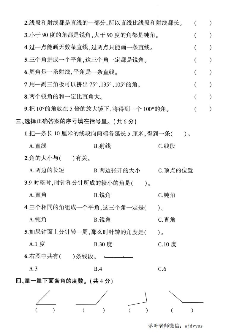 2025人教版四年级数学上册单元测试卷第三单元测试卷器检测时间:90分钟满分:100分+10分题序二三四五六七八附加题总分得分一、填空。(每空1分,共28分)》弥1.线段有()个端点,射线有()个端点,直线有()个端点。毁封2.过一点可以画()条直线,过两点可以画()条直线。3.从一点引出两条()所组成的图形叫做角,这个点是角的(线两条射线是角的()。4.110°比周角小()°,比平角小()°,比直角大()°。内5.我们学过的五类角,按从小到大的顺序排列是:()<()<蠻()<()<()。不6.一个平角=()个直角一个周角=()个平角=()个直角要7.两个大于45°的锐角相加,会得到一个()角,一个钝角减去一个直角得到一个()角。答8.下午3时,钟面上时针和分针所成的较小的角是()角,晚上7时,钟面上时针与分针所成的较小的角是()度。靠题9.∠1加30正好是一个直角,∠1=()°;∠2加60°正好是一个平角,∠2=()°。10.右图中∠1=60°,∠3=28°,则∠2=()°,是一个()角。11.右图为一张长方形纸折起来以后的图形,其中∠1=75°,则∠2=()°。☒二、判断。(对的画“√”,错的画“X”)(共9分)】e1.小亮画了一条15厘米的直线。落叶老师微信:wjdyyss