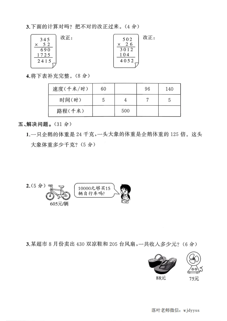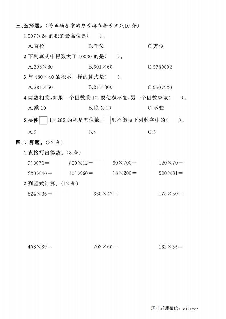 2025人教版四年级数学上册单元测试卷第四单元测试卷时间:90分钟满分:100分+10分题序三四五附加题总分那得分一、填空题。(每空1分,共22分)弥1.用竖式计算145×34时,先算()乘145的积;再算()乘145的积;将两次算得的结果相加,等于()封2.计算150×30时,先算(),再在积的末尾添上()个0。靠3.450×80的积的末尾有()个0。线4.买5本同样的书,一共用了45元,每本书多少元?此题是已知(和(),求(·),列式为()。内5.一辆汽车的速度是每小时85千米,可写作(),读作()。这辆汽车4小时行驶()千米。不6.根据19×6=114直接写出下列各题的积。190×6=()19×60=()要190×600=(190×12=()7.已知a×b=120,若a乘2,b不变,则积是();若a不变,b除以3,则积是()。8.三位数乘两位数的乘积可能是()位数,也可能是()位数。题9.330+340+350+360+370=☐×5,☐中应填()。二、判断题。(对的画“√/”,错的画“X”)(5分)1.188×79的积一定比16000小。2.两数相乘,一个因数乘4,另一个因数除以4,积不变。((3)高元3.因数的末尾没有0,积的末尾也没有0。4.2千克香梨18元,5千克砂糖橘45元,砂糖橘的单价要贵一些。5.两个因数相乘的积,一定比每一个因数都大。落叶老师微信:wjdyyss