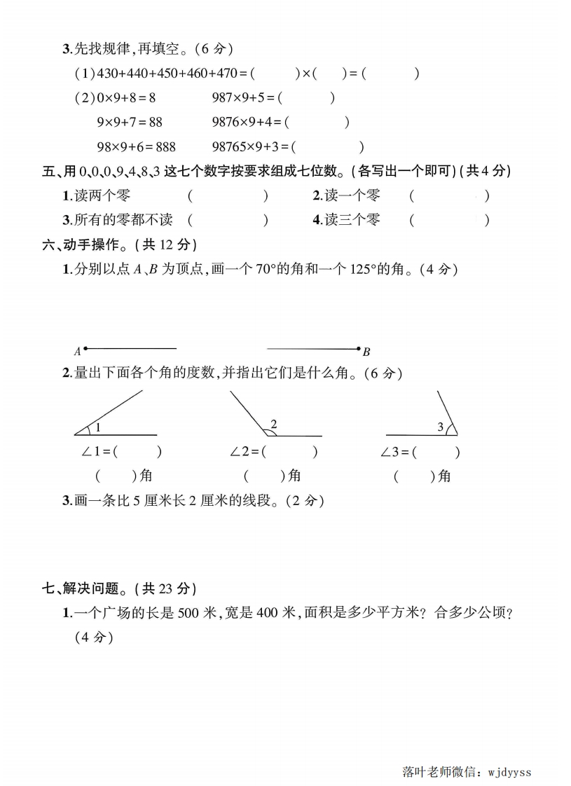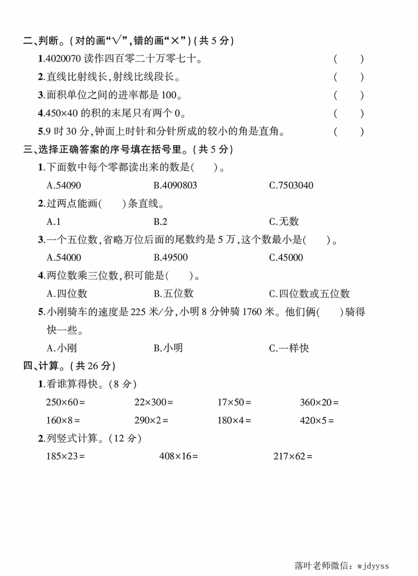 2025人教版四年级数学上册期中测试卷期中测试卷霸检测时间:90分钟满分:100分+10分题序三四五六七附加题总分得分一、填空。(每空1分,共25分)弥1.360030340是()位数,含()个数级,它的最高位是()位;“6”封在()位上,表示();这个数读作(救)。线2.450600是由4个()、5个()和6个()组成的。3.一个数的百亿位上是5,百万位上是3,十位上是8,其余各数位上都是0,内这个数写作(),四舍五人到亿位是()。不4.一辆汽车在高速公路上匀速行驶,2小时行驶180千米,汽车速度可记作()要5.一块正方形菜地的边长是20米,()块这么大的正方形菜地的面积是1公顷。答6.20000000平方米=()公顷=()平方千米。靠题7.括号里最大能填几?)×80<48350x()<41014×()<2708.202510000≈21亿,内可以填(),51×48≈30000,内最小填()o9.两个因数的积是450,其中一个因数扩大10倍,另一个因数不变,积为()o10.把909090、990090、900990、100999四个数按从小到大的顺序排列是:任)<()<()<()落叶老师微信:wjdyyss