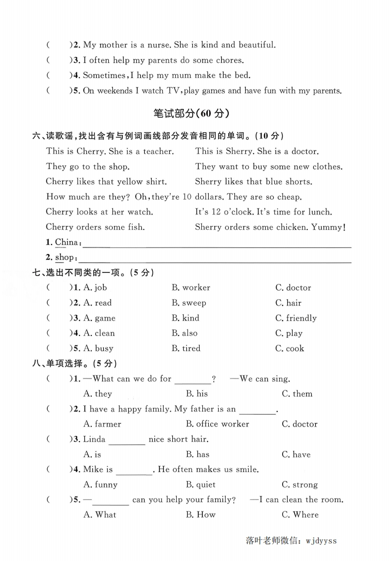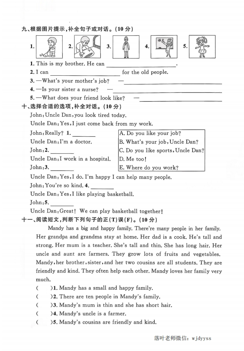 2025人教版四年级英语上册第一次月考卷(检测范围:第一、二单元)(时间:90分钟满分:100分)评价:可68只丨扫听听力部分(40分)可扫听一、听录音,选出你所听到的句子中含有的单词。(5分)()1.A.kindB.readC.child()2.A.ballB.footballC.basketball()3.A.doctorB.farmerC.worker那()4.A.ChinaB.chairC.Chinese()5.A.shipB.shopC.stop二、听录音,给下列图片排序。(5分)救三、听录音,判断下列图片与所听内容是(T)否(F)相符。(10分)四、听录音,选择恰当的答语。(10分)条)1.A.He is tall and strong.B.He is a farmer.崇C.He has short hair.)2.A.Yes,it is.B.No,I don't.C.Yes,he is.)3.A.I'm quiet.B.I like sports.C.I can make the bed.()4.A.Tom.B.He has big eyes.冠C.He is friendly.)5.A.Yes,I do.B.Yes,we can.C.No,it isn't.五、听录音,判断下列句子的正(T)误(F)。(10分)】)1.My father is a factory worker.落叶老师微信:wjdyyss