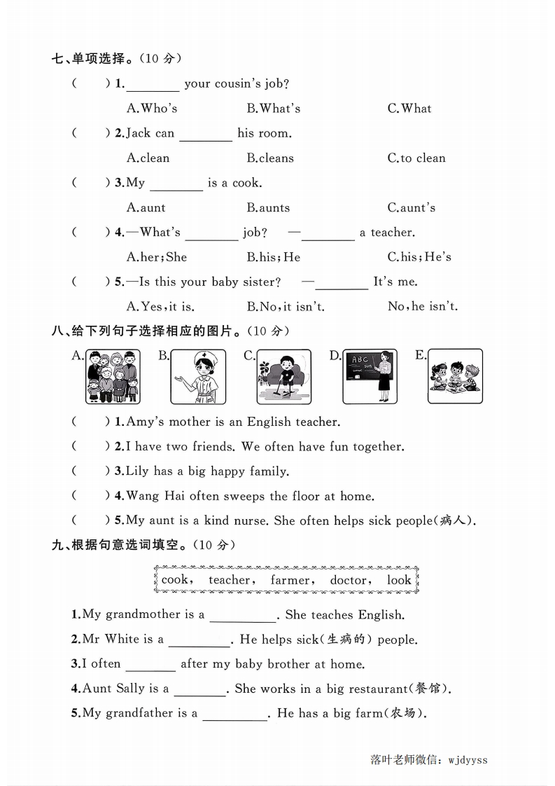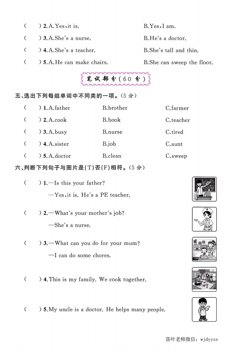 2025人教版四年级英语上册单元测试卷第一单元测试卷时间:60分钟满分:100分题序二三四五六七八九十十一总分得分听力部分(40分)弥尚9扫码听听力一、听录音,选出你所听到的句子中包含的单词。录音听两遍。(10分)封()1.A.familyB.happyC.sorry毁1)2.A.bigB.jobC.great线()3.A.workerB.farmerC.doctor()4.A.doctorB.nurseC.office内)5.A.roomB.bookC.cook二、听录音,判断下列图片与录音内容是(T)否(F)相符。录音听两遍。(10分)要答三、听录音,判断句子正(T)误(F)。录音听两遍。(10分)第()1.Lucy has a big family.题)2.My father is a cook.)3.Mum and dad are busy but happy.)4.Linda can clean her room.)5.Sarah's aunt is an office worker.四、听录音,选择合适的答语。录音听两遍。(10分))1.A.I can do some chores for her.B.You can cook.落叶老师微信:wjdyyss